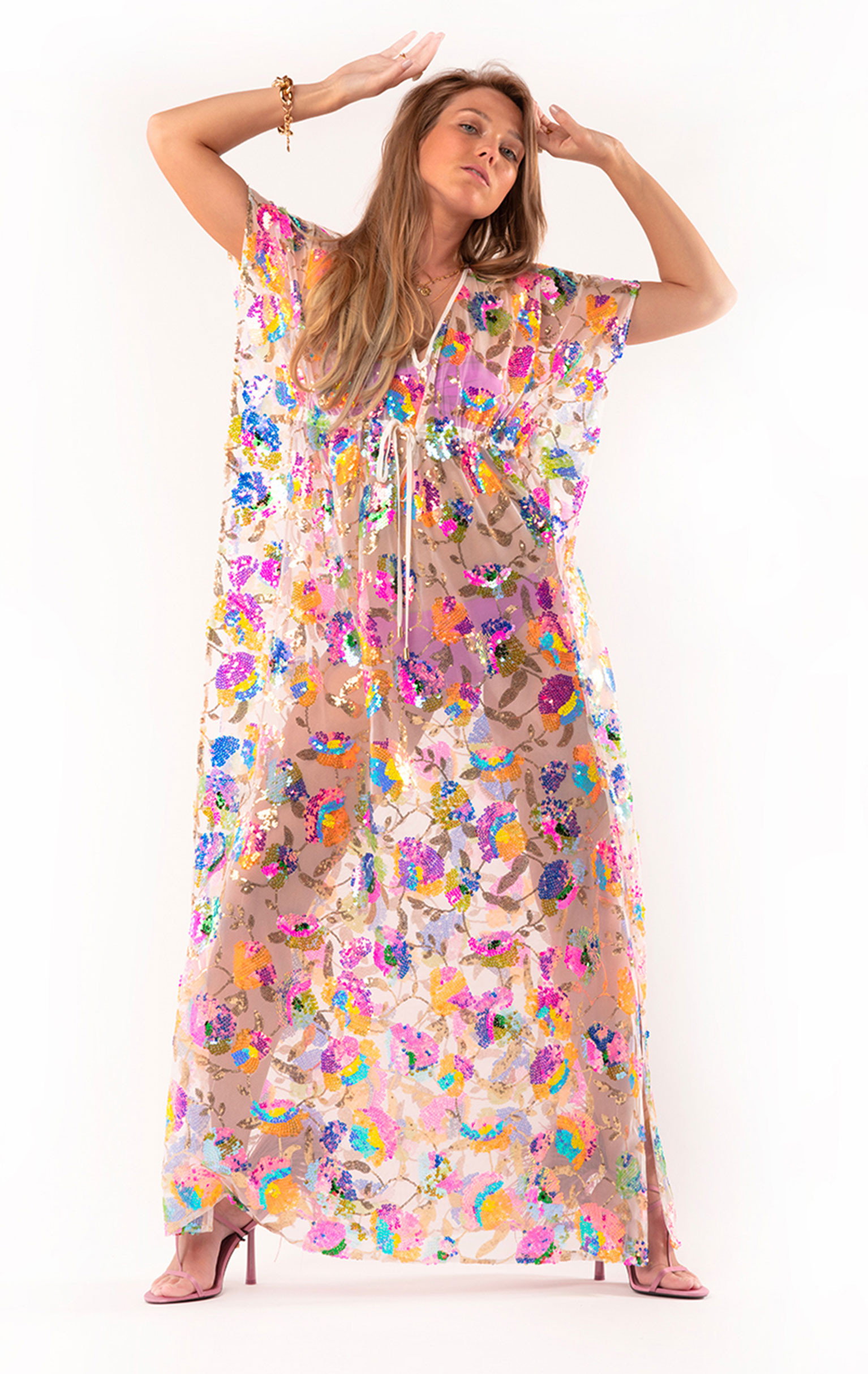 Last call for Ibiza! Dernier appel pour une destination ensoleillée, où il fait bon faire la fête et se dorer sous le soleil avec notre caftan transparent et très précieux. Brodé à la main de fleurs multicolores, il est rehaussé de touches néon très pop, pour un rendu hyper féminin. Avec WILD, la mode est une fête? mais de préférence à la plage!