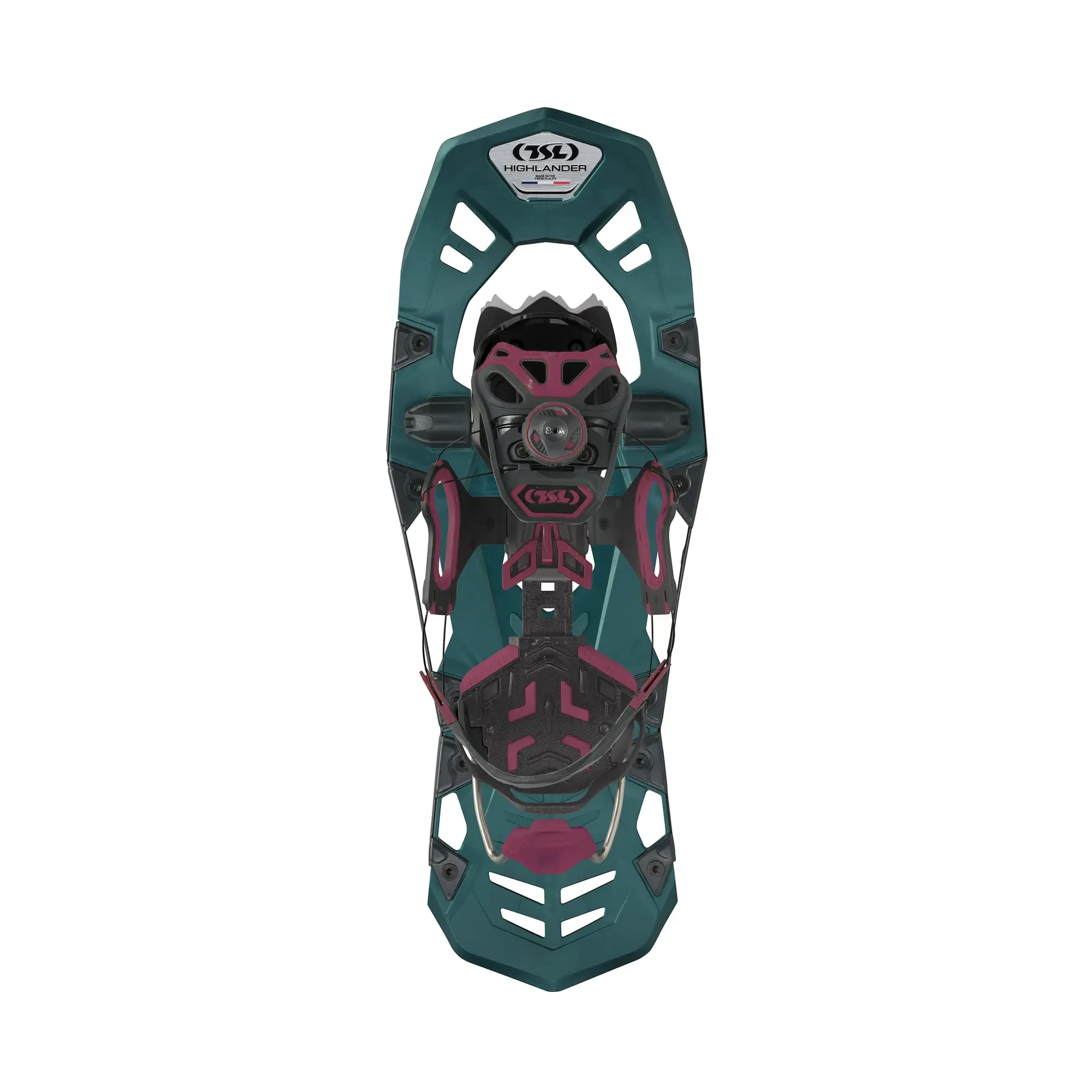 Accroche et légèreté sont au programme de ce modèle de la série Highlander. Le serrage complet du pied en un seul mouvement (BOA® Fit System) vous apportera tout le confort et la fiabilité nécessaire à vos randonnées en quête des versants sauvages.CHÂSSIS / ACCROCHE ULTRA PERFORMANTE DANS TOUS TYPES DE NEIGE- Griffe avantLa griffe avant en inox permet une traction maximale dans les pentes raides. Élaborée à partir d'un inox de très haute performance, elle sera très résistante à l'abrasion et insensible à la corrosion.- Grips latérauxLes grips situés sur le périmètre du châssis apportent une accroche performante sur tous types de neige. Le design 3D en forme de taille de guêpe permet une meilleure accroche et procure un maintien sécurisé dans les dévers. De plus ces grips sont interchangeables facilement en cas d'usure.- CramponsSur neige dure ou glacée le premier point de contact se fait par ces 2 crampons situés sous la zone d'appui du pied.- RockerLe rocker offre un bon déroulé de pied malgré la rigidité du chassis.- Châssis structuré avec barres transversales pour la traction et la retenue sur les neiges douces et compactes.- Contact GripsLes mini barres d'accroche dentelées situées sur les bords des ouvertures centrales dans le châssis permettent une meilleure retenue en neige douce (brevet TSL).- Taille de guêpe = marche naturelleFIXATION- Fixation souple télescopique respectant le déroulé du pied - Lock Adjustment : facile d'exécution, ce réglage permet de mémoriser la pointure de votre chaussure pour toutes les sorties en raquettes à neige.- BOA® Fit System : Par un simple serrage du BOA® Fit System, la chaussure fait corps avec la fixation. La cheville est libérée de tout point de pression. La cale de montée, sous le talon quelle que soit la pointure, évite tout effet de poinçonnement. Le tout, pour 150 g de moins qu'une paire de fixations traditionnelles. - Amortisseur de bruits et de chocs- Cale de montée automatique EASY ASCENT enclenchable avec le bâton. En montée, aucune sensation de poinçonnage sous le pied, le poids étant réparti sur tout le talon de la fixation.Fabrication Française. Livrées avec housse de transport.
