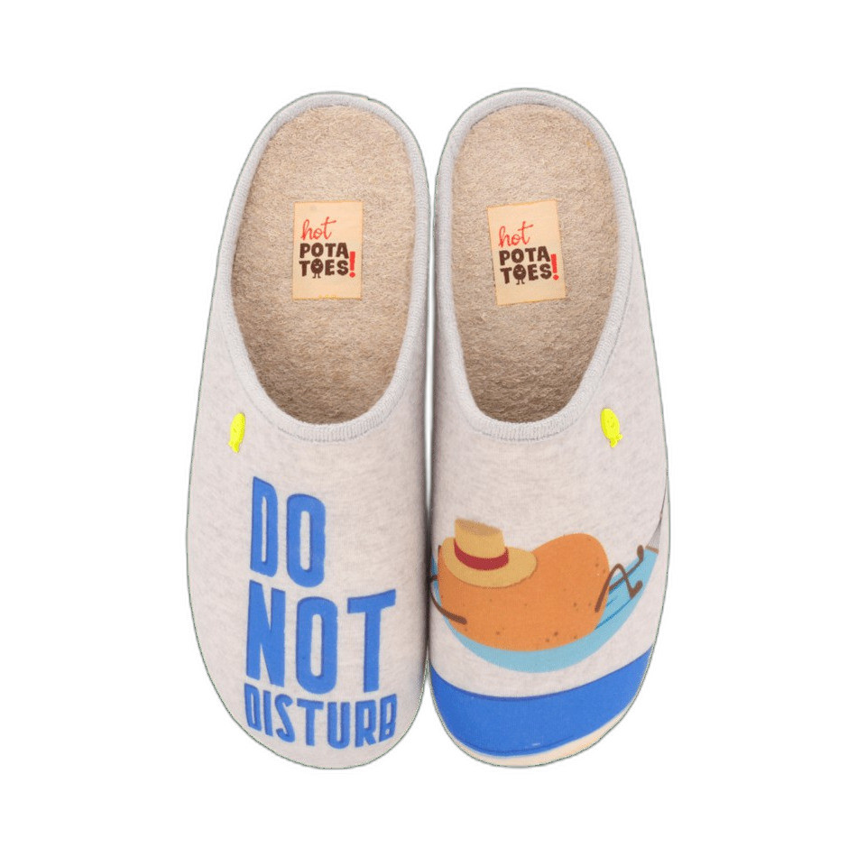 Vous ne connaissez pas encore les chaussons Hot Potatoes ? Chaussons de type babouche avec découpe imprimée en jersey et message « Do not disturb », bordure et semelle en boucle douce et transpirable. Semelle escamotable en matière recyclée et semelle en caoutchouc naturel couleur fluo avec dessins multicolores. Doublure transpirable. Hot Potatoes, ce sont les chaussons les plus confortables, les plus rigolos et les plus durables.