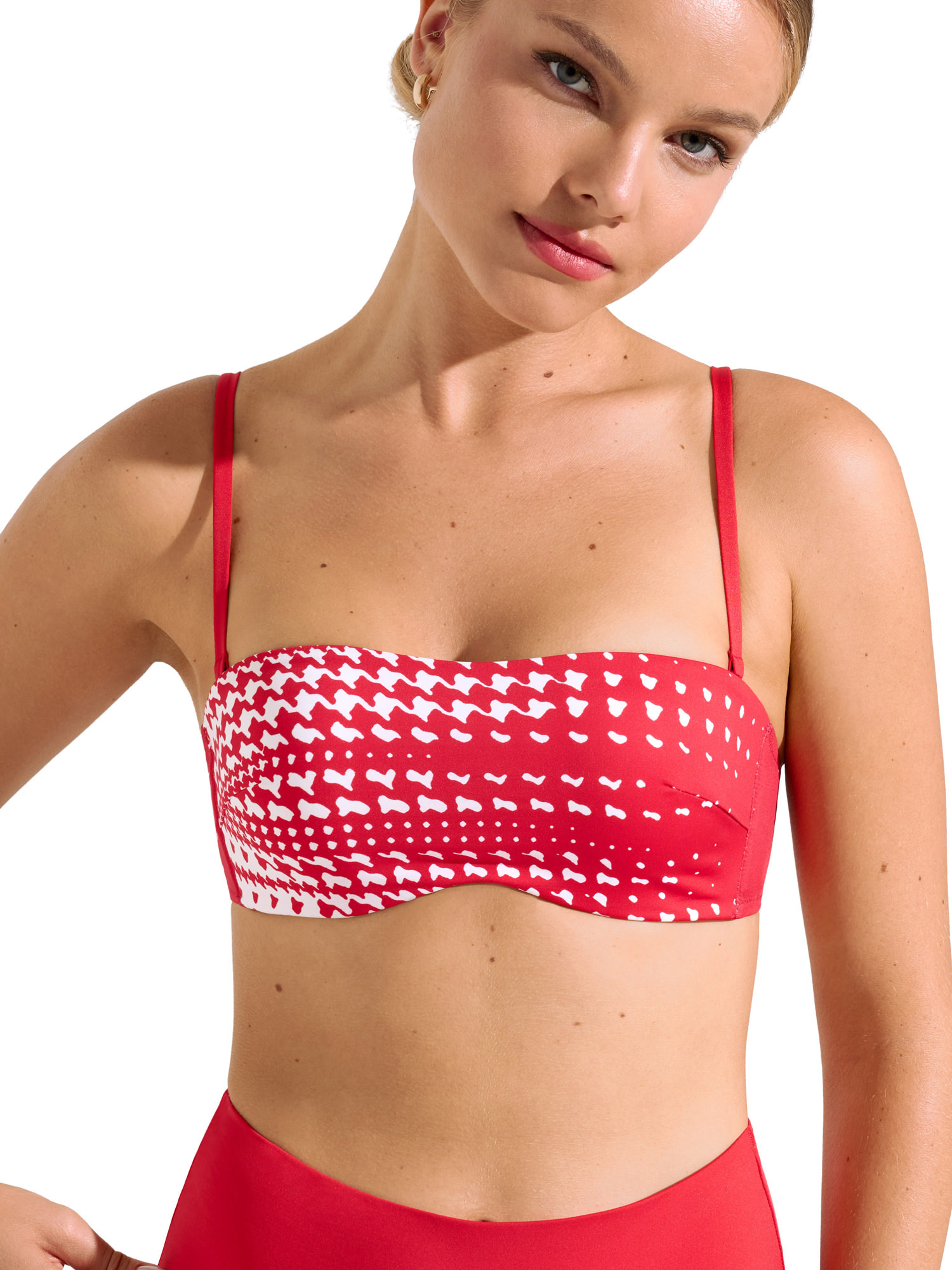 Haut de bikini balconnet bandeau avec bonnets rembourrés intégrés cachés et armatures. Les bretelles sont réglables pour un ajustement parfait, et amovibles, ce qui permet de porter le haut de bikini sans bretelles. Les bretelles peuvent être portées de façon classique ou attachées autour du cou. Fermeture à l'aide d'un fermoir dans le dos.