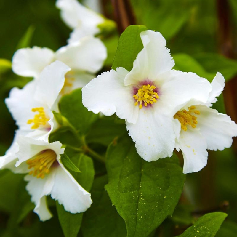 Le seringat 'Belle Etoile' (Philadelphus 'Belle Etoile') est un arbuste caduc apprécié pour sa floraison abondante et son parfum envoûtant. Ses fleurs blanches délicates, aux cœurs légèrement teintés de pourpre, dégagent une intense fragrance rappelant la fleur d'oranger.
