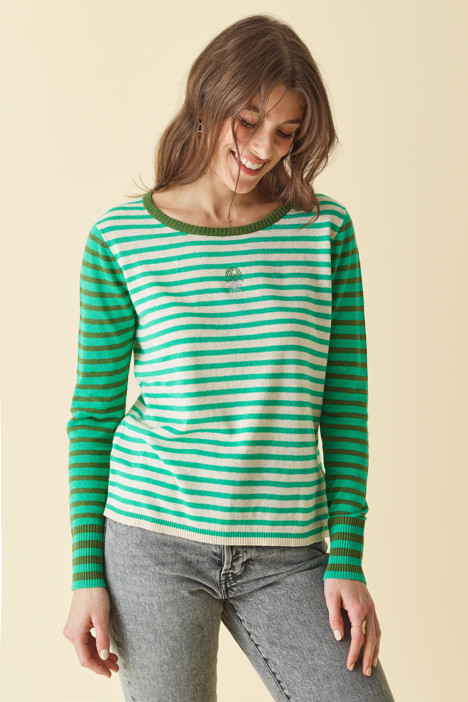 Le pull marinière : cette saison encore, il est en haut du podium ! Marinière en jersey coton/lin idéal pour l'entrée de saison, col rond dégagé, manches longues avec rayures contrastées couleurs, jeux de rayures bicolores, fish clous, coupe droite. Notre mannequin mesure 1m72 et porte une taille 0 ou 36 pour les hauts, taille 36 pour les bas Composition : 55% Lin 45% Coton