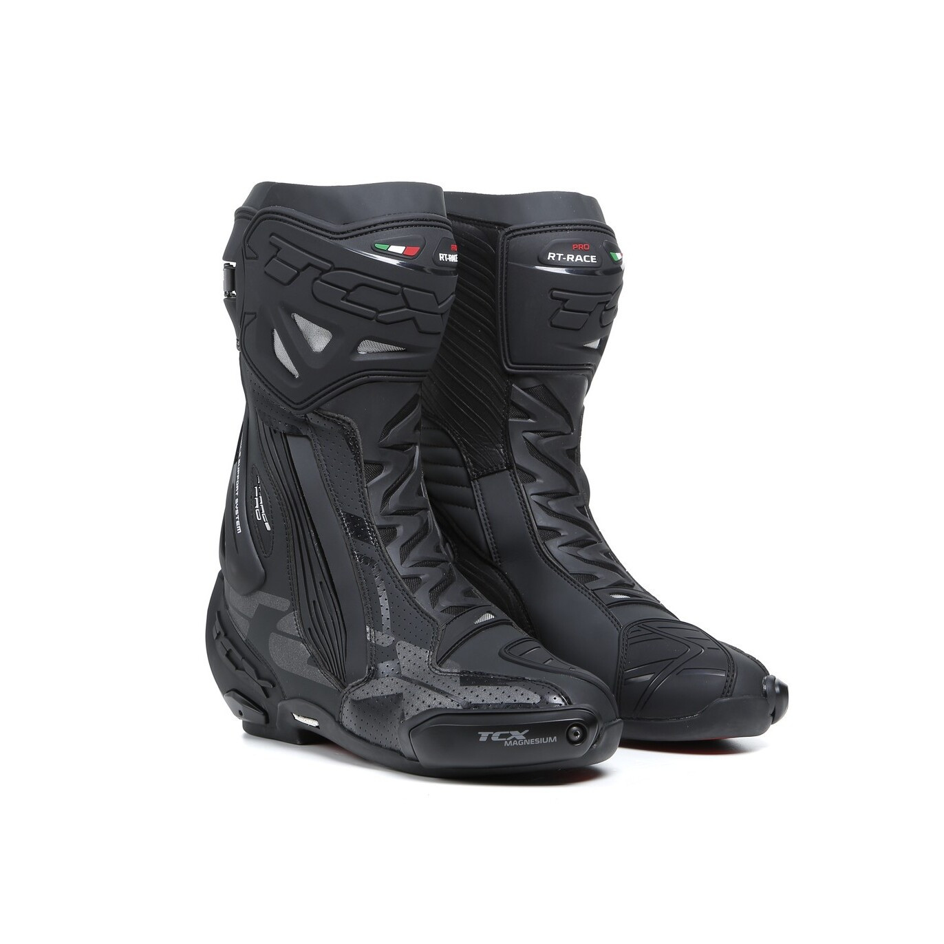 Les bottes de moto RT-Race Pro Air sont le modèle phare de la ligne Racing, produit de la collaboration entre le département Recherche et Développement de TCX et les pilotes courant en MotoGP™, Les RT-Race Pro Air intègrent le Fasten Fit Control, un système de laçage interne connecté à la doublure de la chaussure par un lacet à glissement rapide, qui permet à la tige d’être bien enveloppée et de personnaliser très précisément l’ajustement, Le système de fermeture de ces bottes comprend une boucle à réglage micrométrique et détachement rapide, conçue pour adapter parfaitement la tige aux différentes anatomies de mollet, et une fermeture éclair latérale avec panneau extensible, Les bottes de moto TCX RT-Race Pro Air sont équipées du système anti-torsion Double Flex Control, une articulation en polyuréthane positionnée dans la zone de la cheville capable de contrôler le mouvement au millimètre près, en offrant un appui et une flexibilité optimaux de l’articulation, pour éviter les torsions dangereuses et les blessures éventuelles, Fabriquée en microfibre hautement résistante à l’usure, la tige est perforée pour assurer une ventilation optimale du pied et maintenir un confort parfait même face à des températures élevées, La doublure intérieure est confectionnée en AIR TECH, un tissu mesh respirant, avec un rembourrage de différentes épaisseurs placé au niveau de la cheville, pour offrir un maximum de confort, La semelle « Burnout » réalisée par TCX en collaboration avec le centre de recherche Michelin® s’inspire du pneu Michelin® « Power Supersport Evo », Elle présente une semelle d’usure bi-composite à zones d’adhérence différenciées, conçues pour garantir un plus haut niveau d’adhérence sur le repose-pieds et le sélecteur et une plus grande résistance à l’usure et à l’abrasion contre l’asphalte, Le profil est complètement intégré à la tige et le talon se distingue par un angle incliné capable de garantir un appui optimal sur les repose-pieds, La pointe et le talon sont dotés de sliders interchangeables en magnésium pour faciliter la glissade au contact de l’asphalte, Des renforts supplémentaires en polyuréthane sont présents dans les zones les plus exposées : le tibia, la cheville, la pointe et le talon,