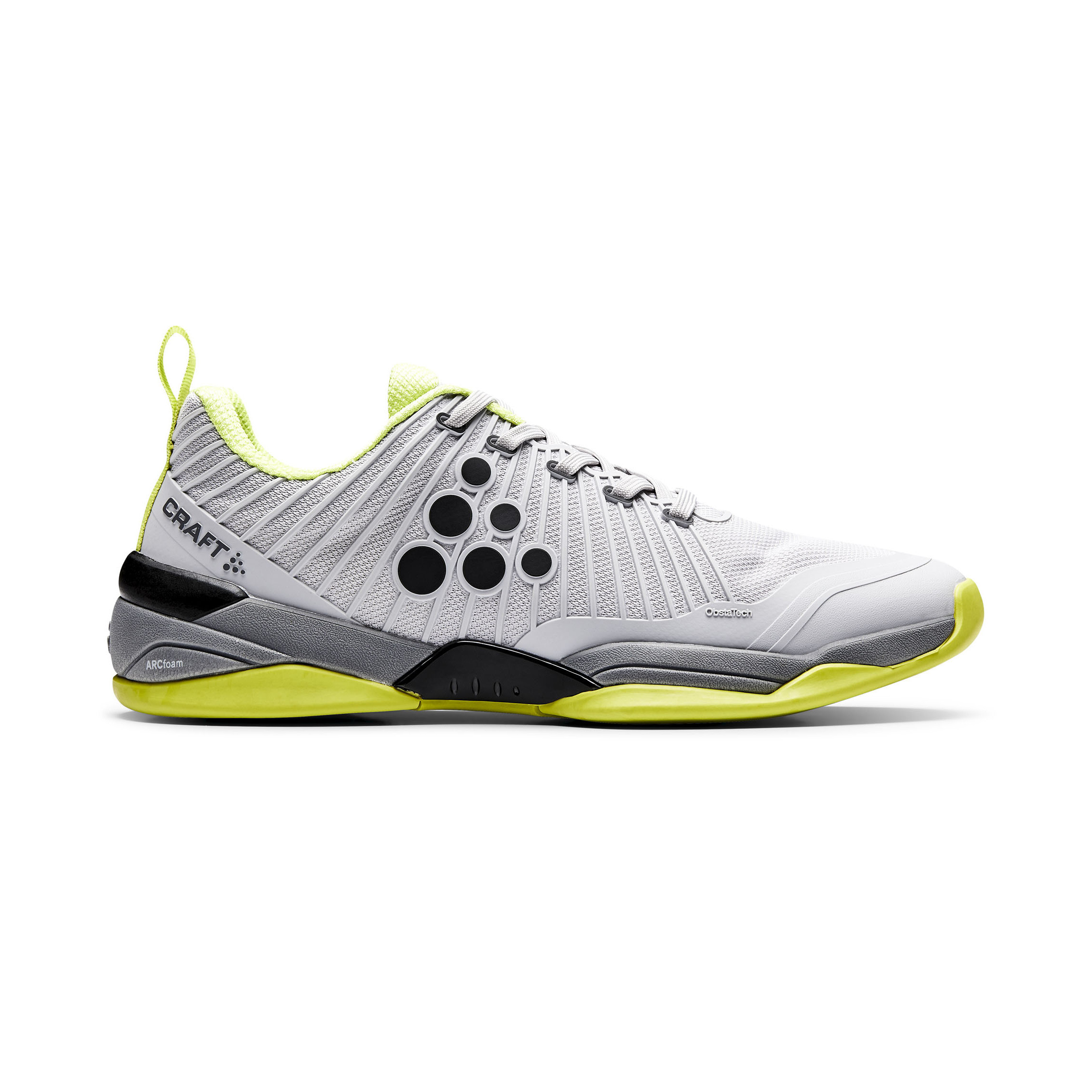 Cette chaussure est réceptive et légère, et permet d’atteindre de grandes vitesses tout en maintenant son niveau de durabilité et de soutien au plus haut. Une couche de mousse ARC Foam™ plate, dotée d’une semelle extérieure en caoutchouc adhérant totalement au sol pour une meilleure traction procure une excellente sensation de contact avec le sol, tandis que sa forme est parfaitement conçue pour offrir une excellente stabilité latérale. Le dessus de la chaussure est doté d’une structure grillagée en KPU flexible, légère et incroyablement solide. Cette chaussure possède tous les attributs pour les athlètes d’intérieur sérieux. - Dessus en nylon maillé durable tout en étant respirant. - Structure grillagée en KPU avec côtes flexibles au centre du pied, couche de stabilité au niveau du talon, renforts solides au niveau des orteils et renforts supplémentaires latéraux afin d’éviter les dérapages. - Semelle intermédiaire en mousse ARC Foam™ avec réglage réceptif - La semelle extérieure est dotée de caoutchouc adhérent de première qualité pour une traction maximale - Structure en TPU sous le pied pour une stabilité hors du commun - 100% Textile (70% nylon + 30% polyester) + KPU 100% EVA, Semelle extérieure: 100% caoutchouc