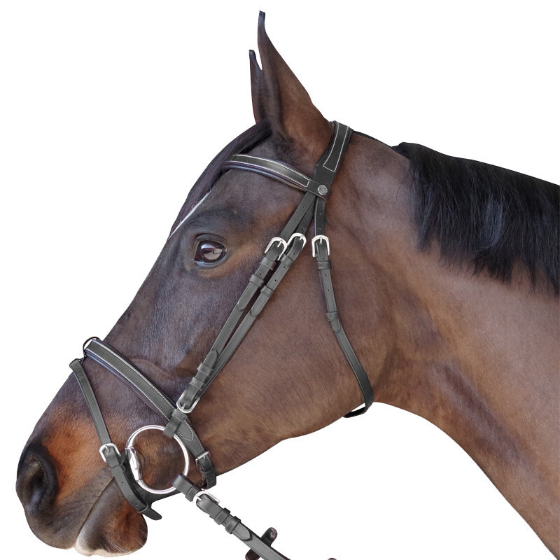 Frontal et muserolle combinée plats et doublés. Têtière anatomique doublée, pour plus de confort. Bouclerie carrée laiton. Rênes caoutchouc.