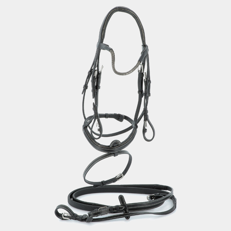 Frontal cuir rond et brillant. Muserolle combinée, doublée, bombée 1/2 rond et galonnée avec cuir brillant. Têtière anatomique, doublée avec empiècement cuir brillant. Bouclerie Inox gravée F&C. Livré avec rênes caoutchouc eventer.