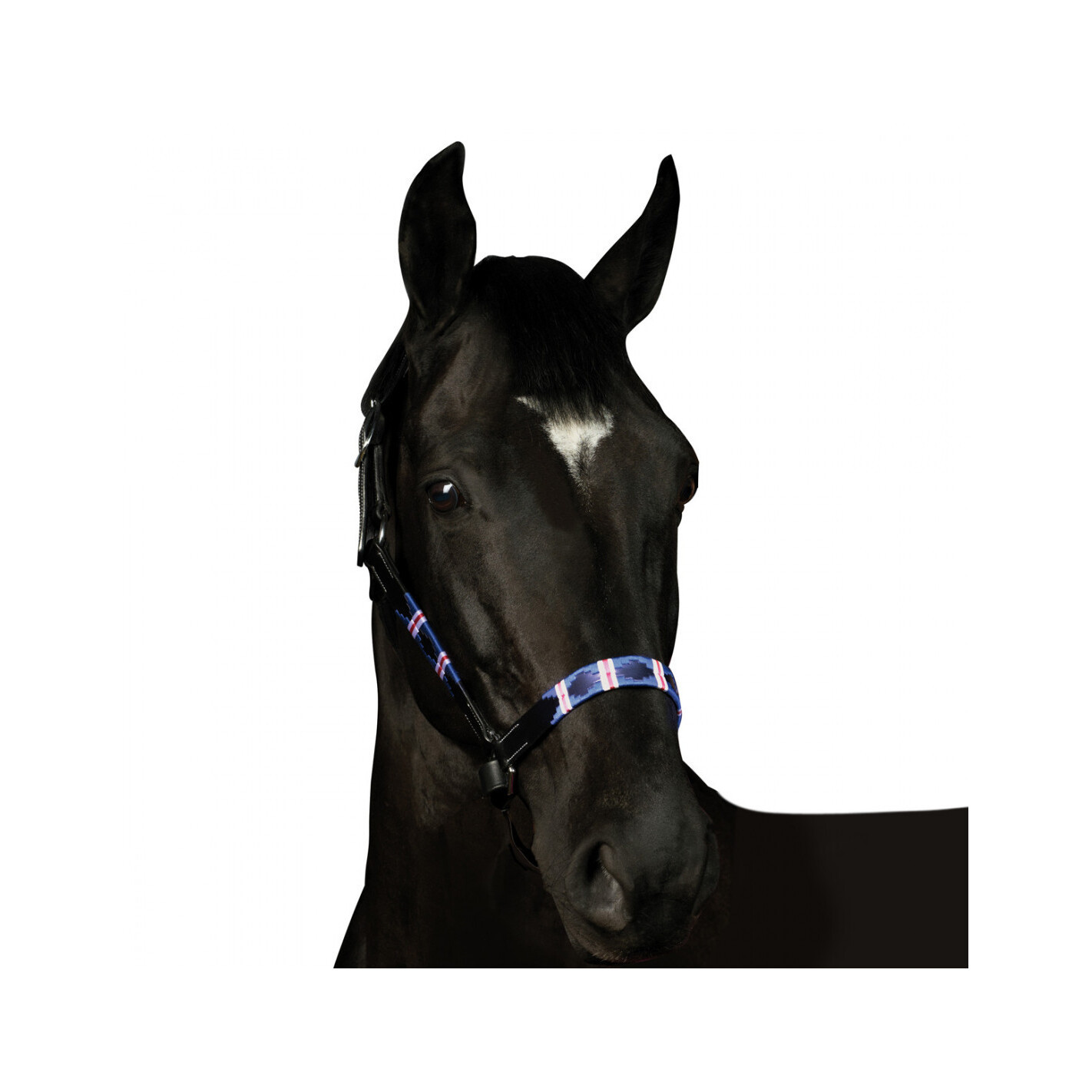 Licol cuir souple et brodé. Têtière doublée, et ajustable par 2 boucles. Muserolle avec boucle de réglage. 1 mousqueton à ouverture rapide. Bouclerie inox.