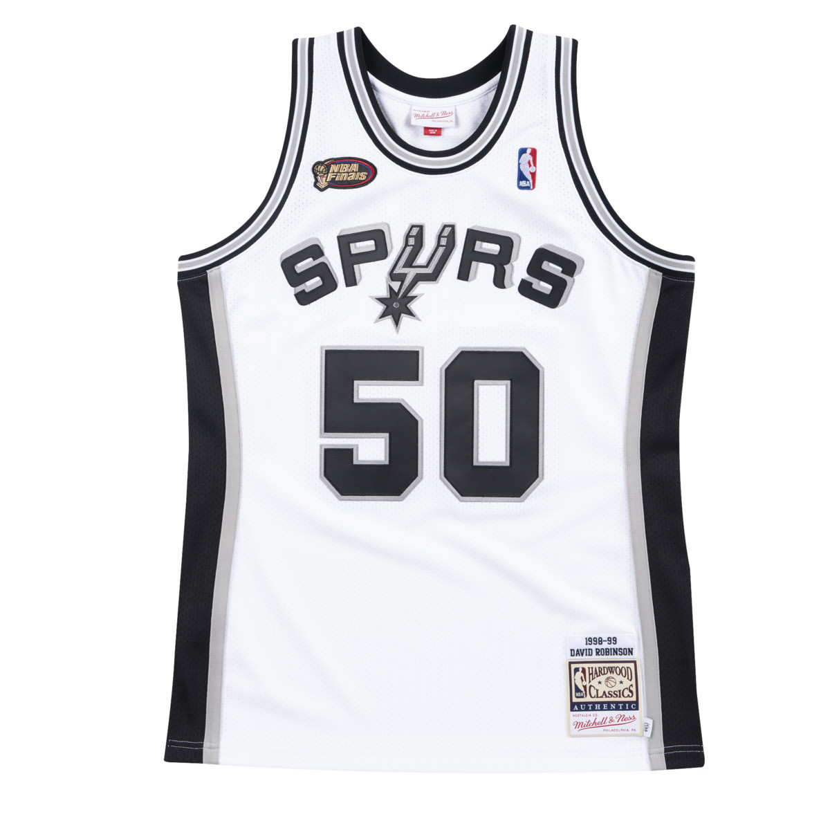 - À sa dixième saison en NBA et avec les Spurs, le All-Star Center David Robinson a enfin pu soulever le trophée du championnat. - La saison 1998-99 a été raccourcie à 50 matchs après un lock-out suspendu les premiers mois de la saison. - "The Admiral" et les Spurs ont terminé la saison régulière avec le meilleur bilan de la ligue, 37-13. - Ils ont traversé les trois premiers tours des séries éliminatoires en ne perdant qu'un seul match contre les Timberwolves au premier tour. - Ils ont affronté les Knicks favoris en finale mais les ont gérés avec une relative facilité. - La seule victoire des Knicks est survenue dans le troisième match. - Les Spurs ont remporté les deux suivants pour remporter leur premier titre NBA et devenir la première ancienne équipe ABA à remporter un championnat NBA CARACTERISTIQUES ET ENTRETIEN - Corps en filet 100 % polyester - Logo, nom et numéros en sergé - Écusson du logo NBA Finals sur l'épaule droite - Ligue tissée, nom du joueur et étiquette d'identification de l'année en bas à gauche de l'ourlet. - Lavage à froid/séchage à l'air libre - Veuillez vous référer à l'étiquette volante interne spécifique pour plus de détails