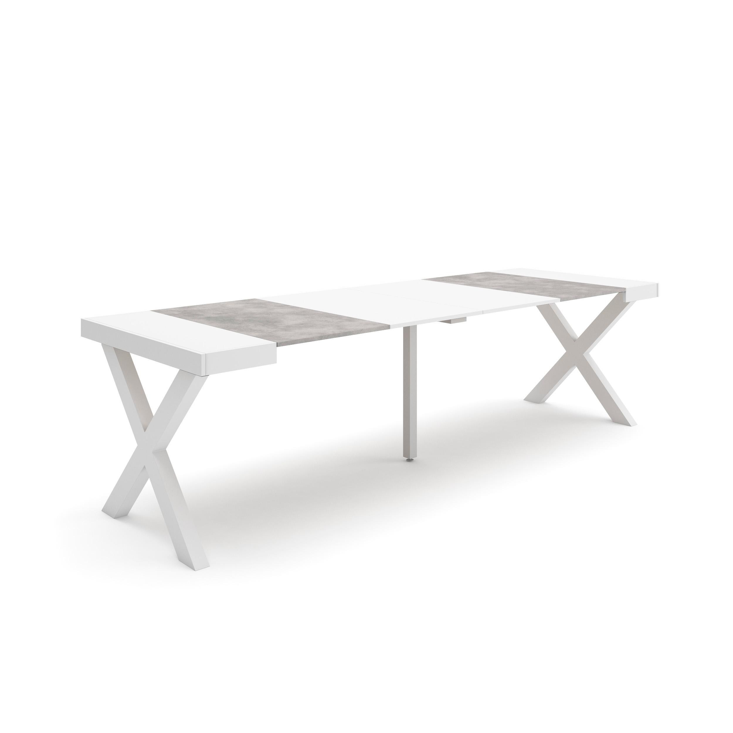 Table console extensible, 262x90x73cm, Pour 12 personnes, Pieds bois massif, Blanc et ciment