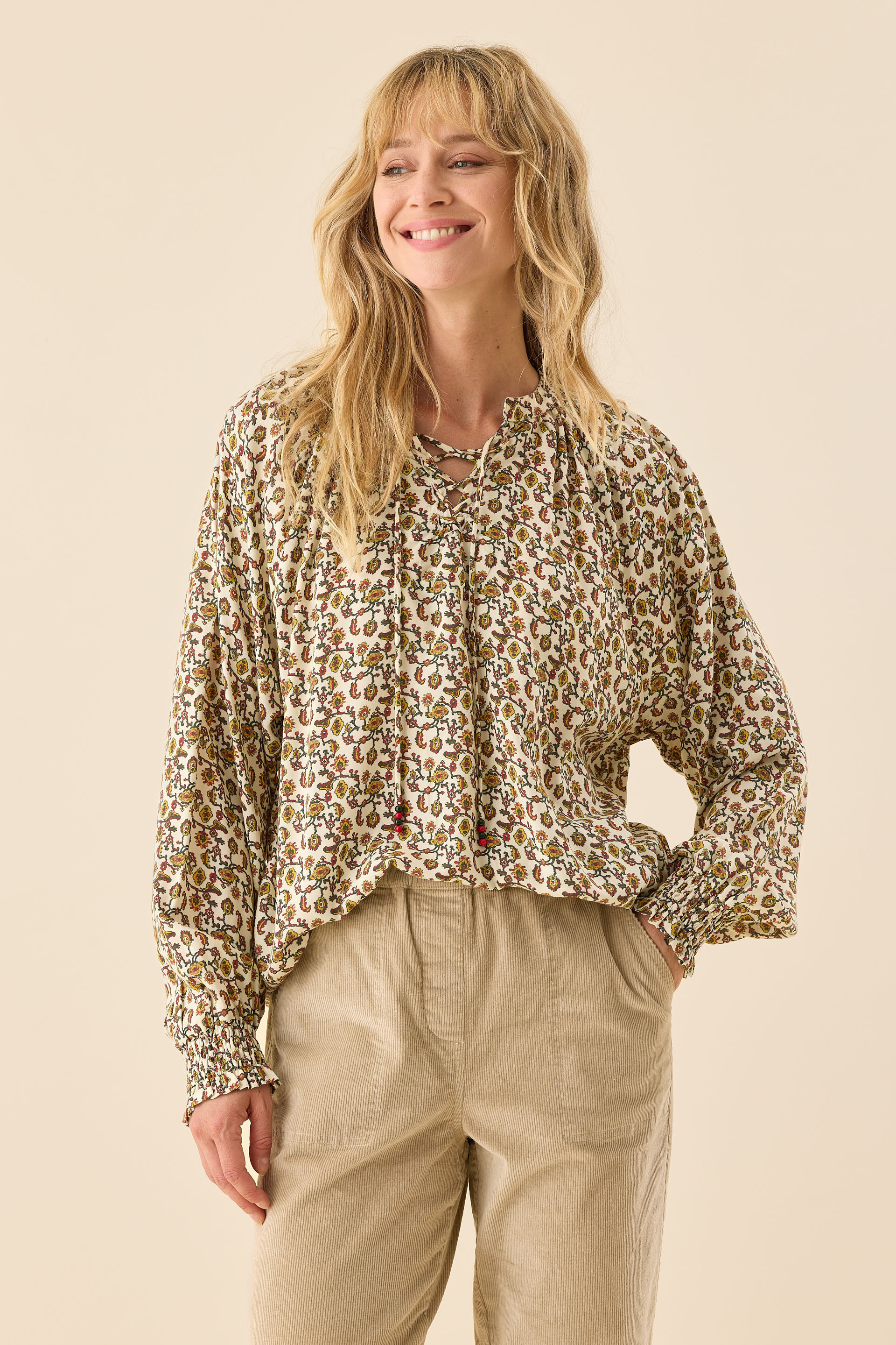 Information sur l'offre : Cette saison misez sur l'imprimé exclusif 'PERSAN' aux inspirations cachemires revisitées ! Blouse encolure laçage, liens finitions perles couleurs, manches longues bas élastiqués avec petits volants, coupe ample, fish pampille métal argent. Notre mannequin mesure 1m70 et porte une taille 0 ou 36 pour les hauts, taille 36 pour les bas Composition : 55%Viscose 45%Coton