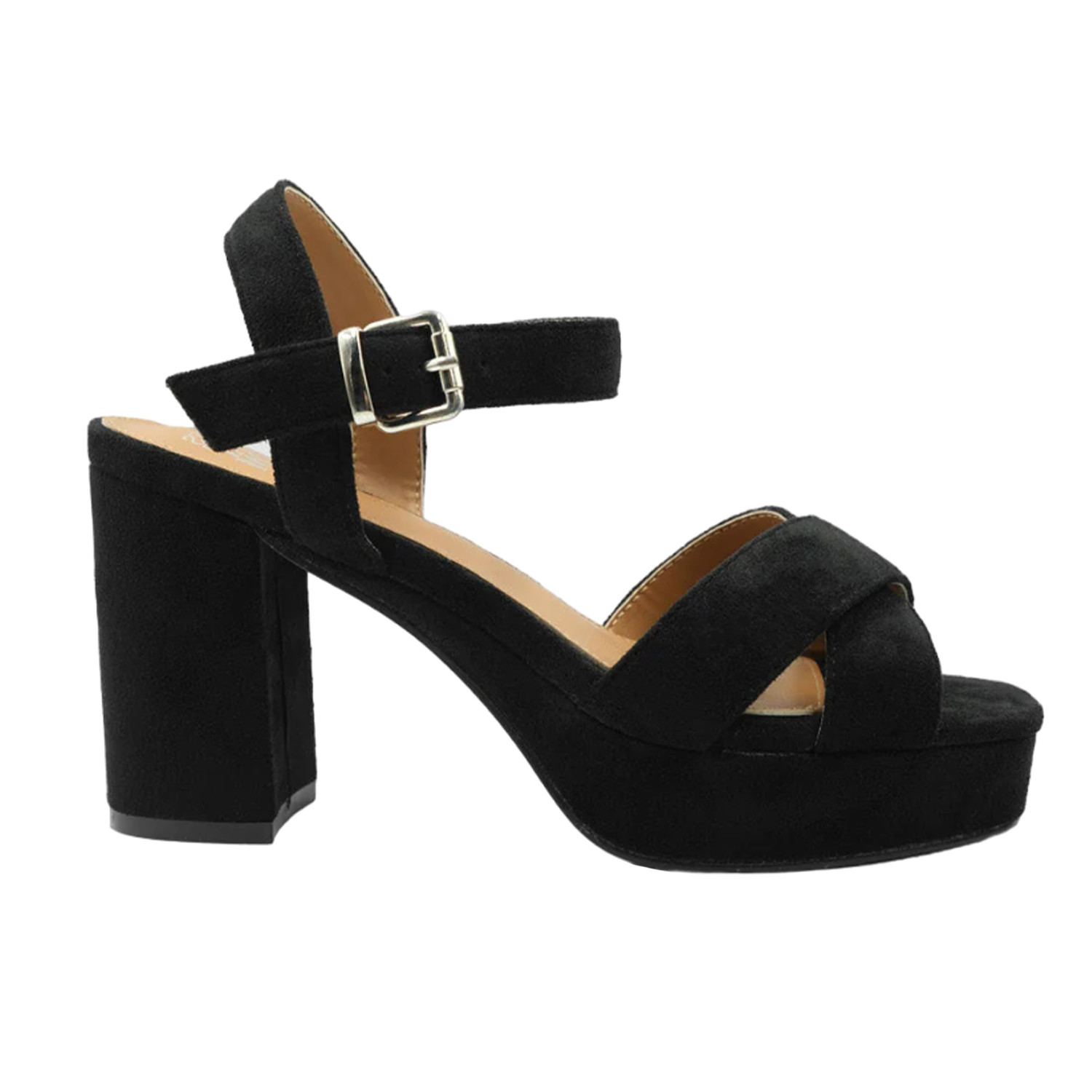 Design/motif: Uni. Style du bout: Ouvert. Talon: Gros talon haut. Fermeture: Boucle ajustable, Sangle à la cheville. Caractéristiques: Sangle croisée, Plateforme. Propriétés des matériaux: Durable. Dessus: Daim. Hauteur du talon: 10,41 cm.