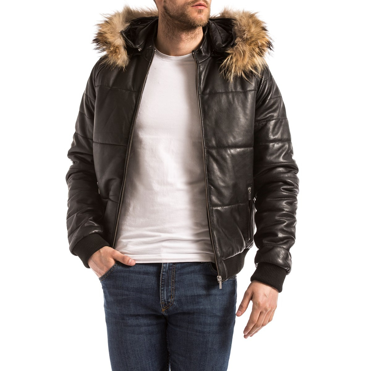 Doudoune en cuir de mouton, coupe ajustée, capuche avec fourrure amovible synthétique.