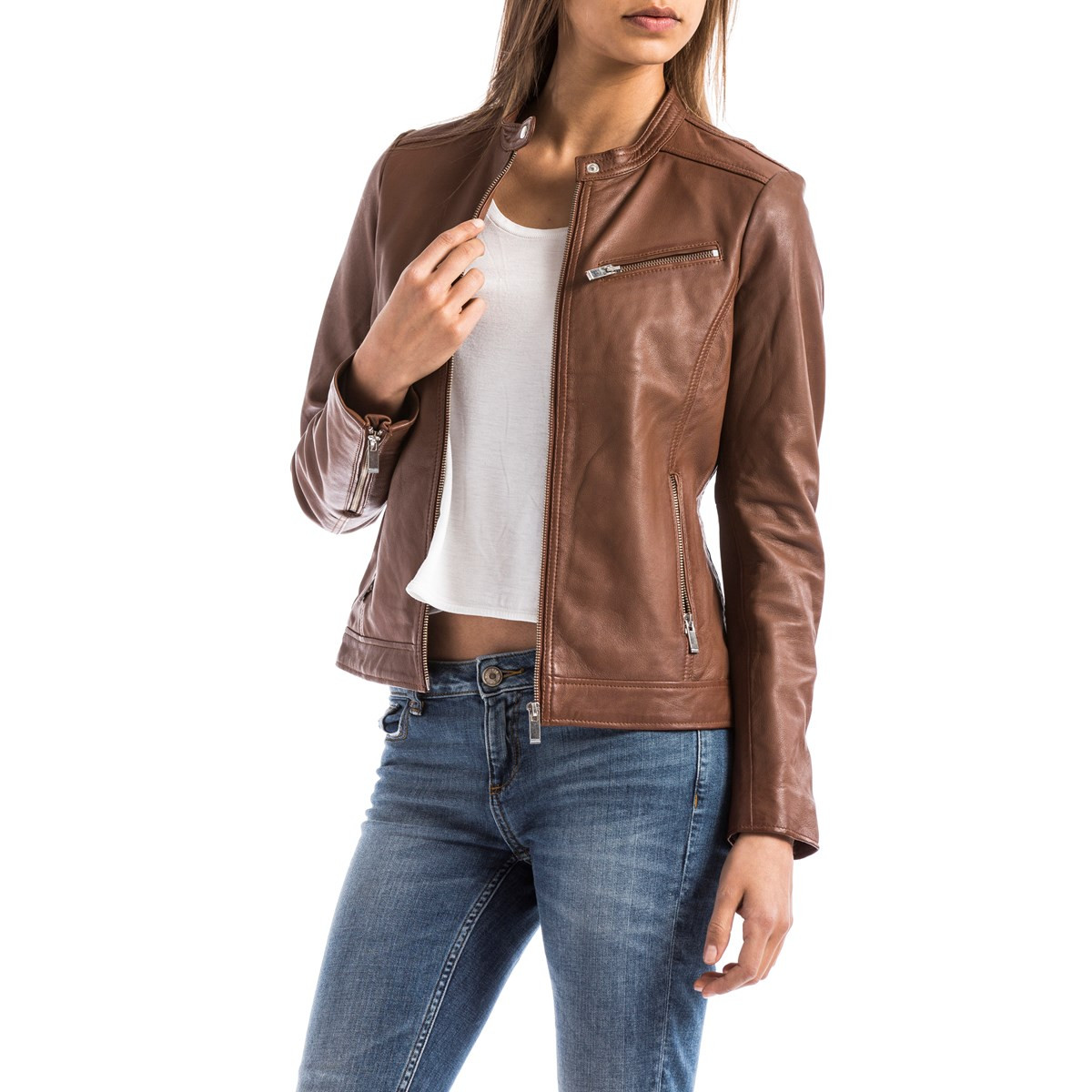 Blouson en cuir de mouton véritable avec col motard