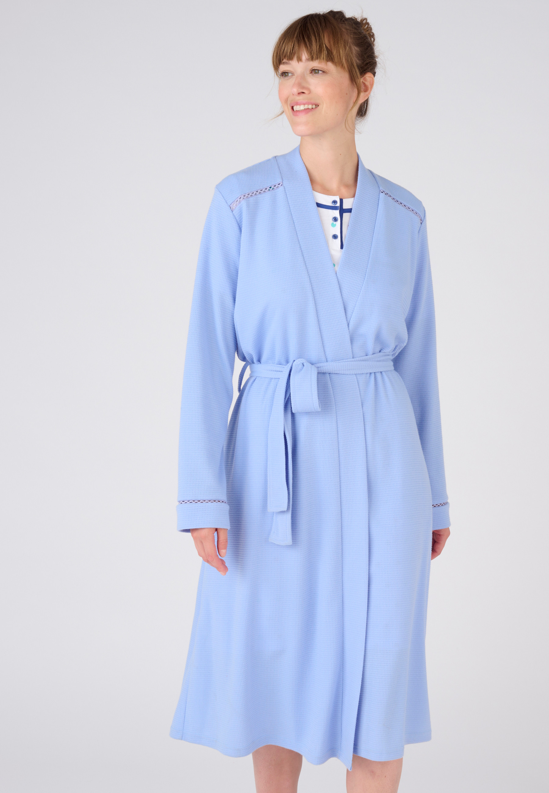 Information sur l'offre : Belle maille fantaisie pour cette robe de chambre. Forme croisée. Col châle. Fermeture par ceinture sous passants à nouer + lien intérieur. 2 poches. Manches longues. Jolies finitions ajourées aux épaules et aux bas des manches. Longueur de la robe de chambre femme 112 cm environ.