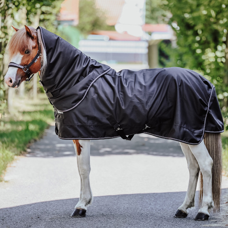Protège-cou pour compléter la couverture d'extérieur "Island" pour chevaux islandais Le protège-cou "Island" a une forme idéale et tient l'encolure du cheval agréablement chaude grâce à sa doublure en ouate de 50 grammes. Comme la couverture d'extérieur, le couvre-cou est imperméable au vent et à l'eau et respirant (colonne d'eau de 4000 mm, respirabilité de 3000 g/m2). Pour éviter qu'elle ne glisse, la partie du cou est munie de deux fermetures velcro sur le côté et de deux autres sur le dessous du cou. La couverture d'extérieur assortie au couvre-cou se trouve sous le numéro d'article 46310. - résistant au vent et à l'eau - respirant - résistant à la déchirure et à l'abrasion - deux fermetures velcro sur les côtés pour la fixation à la couverture d'extérieur - deux fermetures velcro sur le dessous du cou Taille : S Composition : 100 % polyester Doublure : 50 g de ouate Couleur : noir Utilisation Un couvre-cou est utilisé pendant les saisons les plus froides, lorsque non seulement le corps mais aussi l'encolure du cheval doivent être protégés du froid et de l'humidité. C'est surtout le cas pour les chevaux tondus. L'encolure du cheval est très sensible et doit être protégée du froid et de l'humidité au même titre que le reste du corps. En cas de pluie notamment, un couvre-cou permet d'éviter que l'eau ne pénètre dans la couverture au niveau de l'encolure. Conseils d'entretien Lavage en machine jusqu'à 30°C. Lavage délicat.