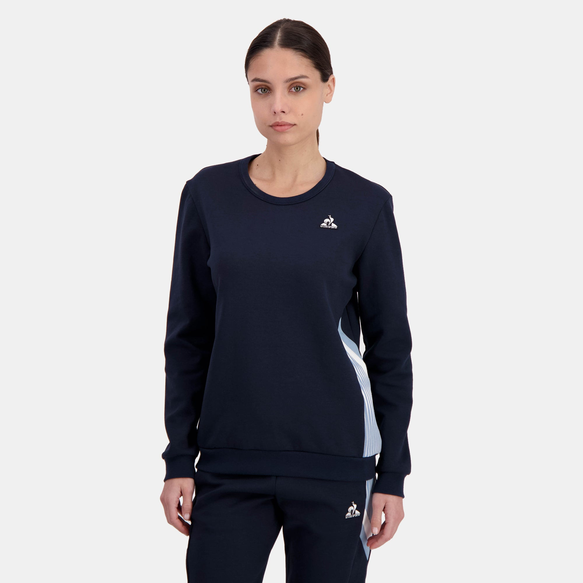 Notre crew Sweat gris pour femme, confectionné en mini molleton et composé d'un mélange de coton et de polyester sera votre produit phare. Il est spécialement conçu pour offrir une sensation de douceur et de souplesse, tout en étant extensible pour un confort optimal au quotidien. Sa coupe regular assure une silhouette adaptée à toutes vos activités. Les finitions en côte 1x1 à l'encolure, aux bas de manches et au bas de corps garantissent une tenue ajustée et confortable. Les empiècements contrastés sur le côté gauche propre à notre collection Héritage, ajoutent une touche de style élégant et distinctif. Parfait pour les journées décontractées ou les sorties sportives, ce crew Sweat combine style, confort et durabilité, vous accompagnant avec douceur. Complétez votre tenue à l'aide du pantalon de la même collection ! CARACTERISTIQUES TECHNIQUES : - Sweat manches longues - Double face 1ch/2 Polyester/Coton - Bonne tenue, agréable et doux au porté - Coupe regular/classique - Empiècement côté bas devant gauche en matière fantaisie Polyester/Coton et empiècements côté haut gauche contrastés unis coton/polyester - Côte 1x1 à l'encolure, aux bas de manches et bas de corps - Badge brodé "Logo du Coq" appliqué sur la poitrine côté gauche au porté