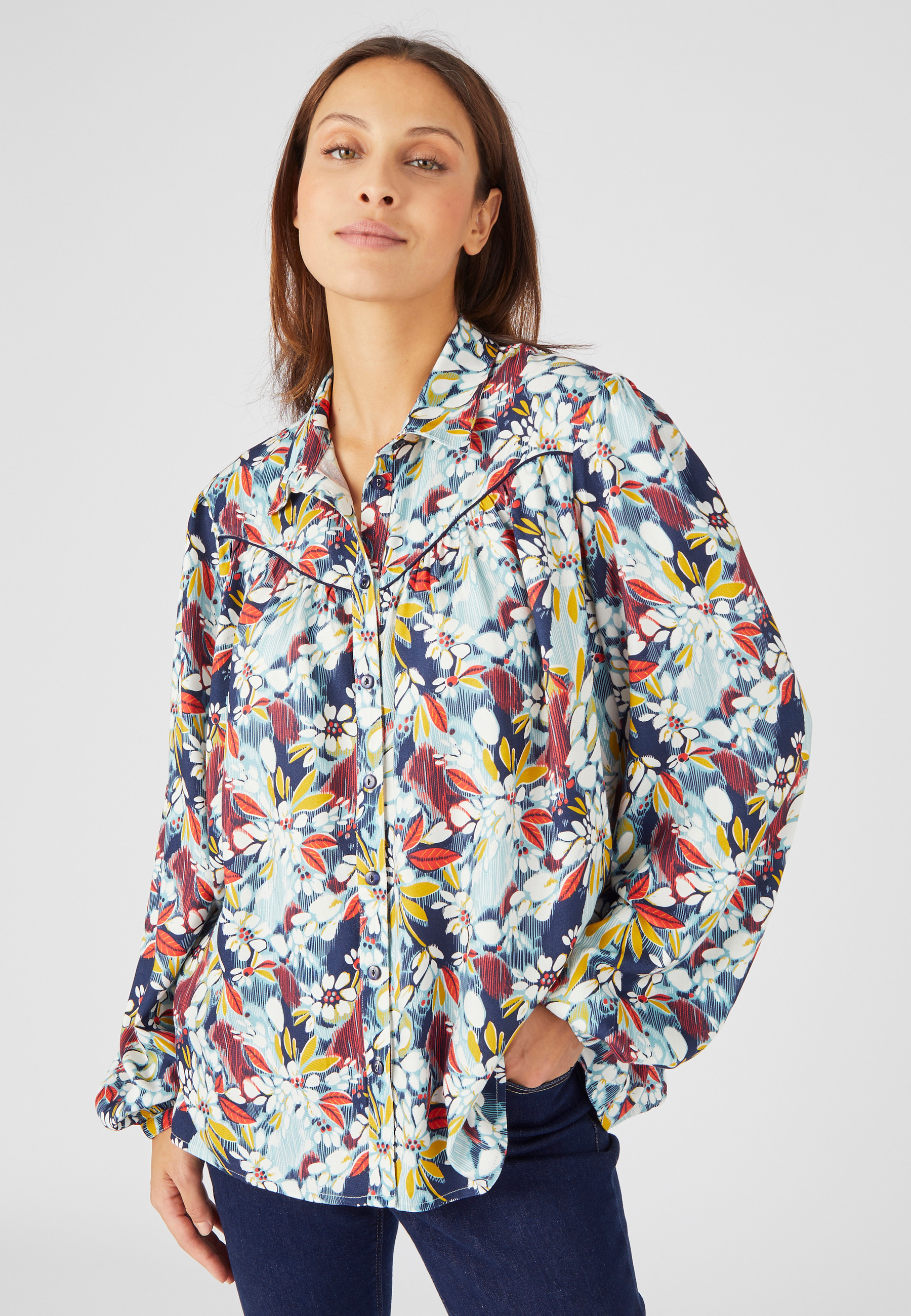 Information sur l'offre : Une belle fluidité, une grande souplesse, ce chemisier a plus d'un argument pour investir votre garde-robe. On ne résiste pas à son univers floral et son look chaleureux qui apportent un réel plus à vos jupes et pantalons, même les plus simples. On aime sa coupe évasée, ses fronces placées sous l'empiècement poitrine souligné d'un passepoil contrastant et ses manches ballon pour un effet bouffant actuel. On l'associe à un pantalon jambe fuselée pour une silhouette élancée. On le porte blousé dans un jean pour un style plus décontracté. Col chemisier monté sur pied de col. Patte de boutonnage pour une bonne tenue. Fronces en tête des manches longues à bracelets boutonnés. Empiècement et fronces d'aisance au dos pour une réelle liberté de mouvements. Longueur du chemisier femme imprimé 64 cm environ.