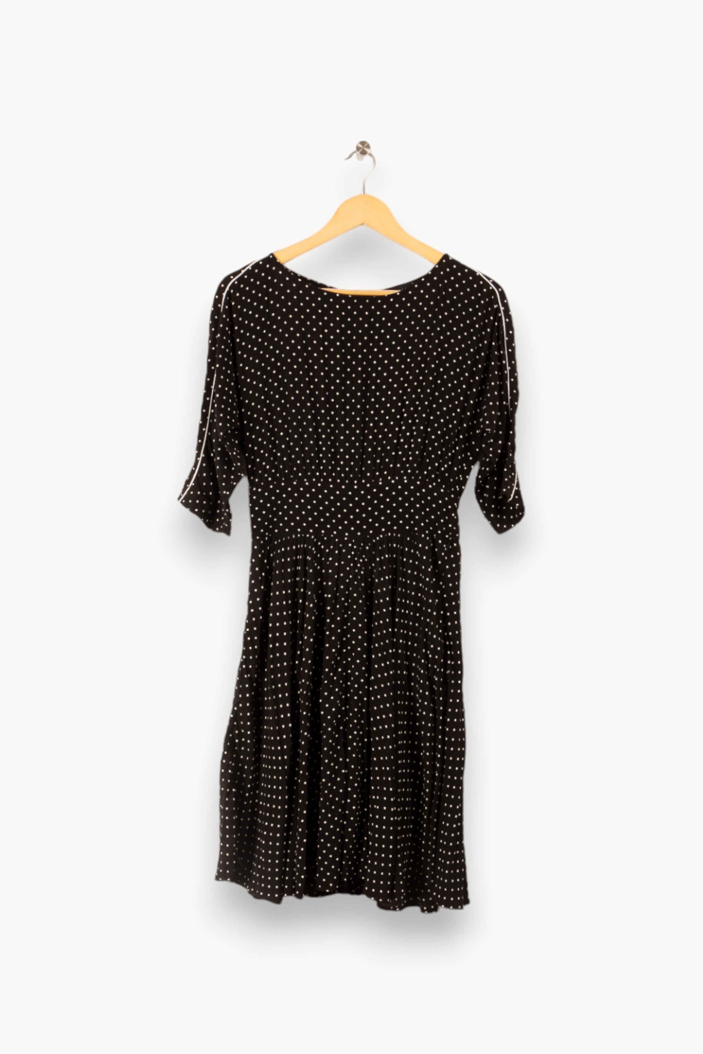 Découvrez cette élégante robe noire Caroll, un incontournable pour toute garde-robe à la recherche d'une touche de sophistication. Confectionnée en viscose douce, cette pièce présente des motifs losanges blancs qui ajoutent une dimension graphique subtile. Parfaite pour une silhouette chic, cette robe courte s'adapte à toutes vos occasions, qu'elles soient formelles ou décontractées. Son design intemporel et sa couleur noir classique vous permettront de l'associer facilement avec vos accessoires préférés. Ajoutez cette robe Caroll à votre collection et faites un pas vers la mode responsable en choisissant une pièce de seconde main, alliant style et durabilité.