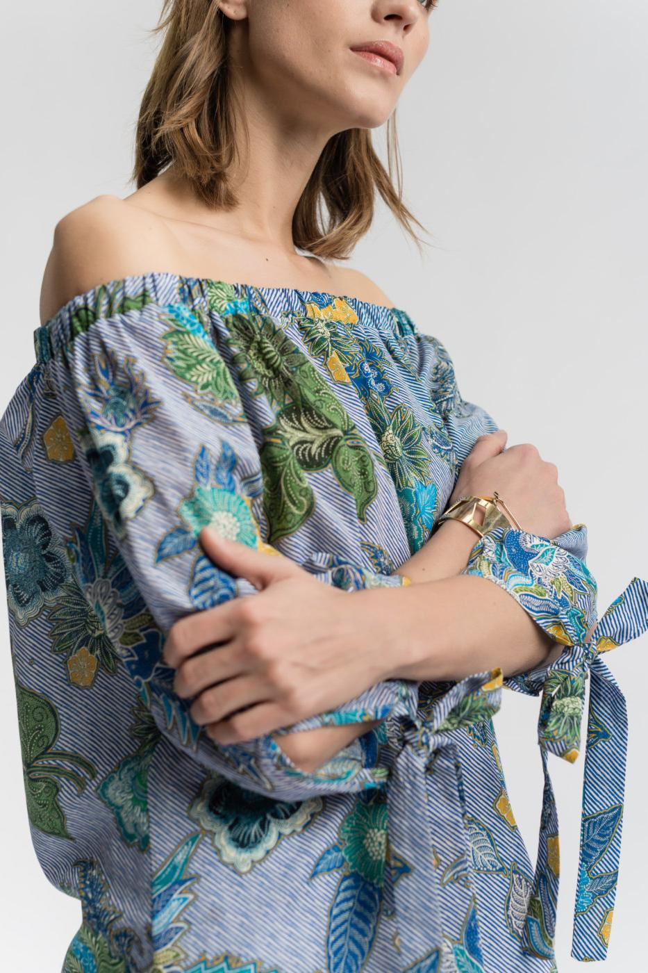 Parfaite pour le printemps et pour l'été, cette blouse aux manches 3/4 dispose de 2 nœuds au bout des manches. Son col est élastiqué afin de la porter épaules dénudées. En coton, cette blouse dispose d'un imprimé rayures bleues et blanches et de motifs végetaux colorés. Soyez certaine de ne pas passer inaperçue en portant cette belle pièce. Associez-la à une jupe moutarde par exemple.
