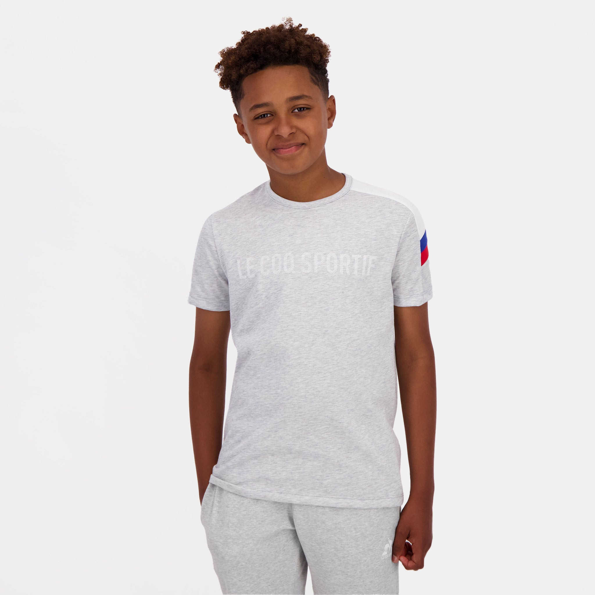 Ce t-shirt gris de notre gamme tricolore en jersey 100% coton est agréable et doux au porté. La coupe classique et son col tressé apportent un confort supplémentaire au produit. Retrouvez une étiquette Bleu/Blanc/Rouge appliquée au milieu du dos de l'encolure. Vous retrouverez également une écriture > sérigraphiée sur le milieu de la face avant du t-shirt. Disponible également en rouge ou en bleu. CARACTERISTIQUES TECHNIQUES : - T-shirt manches courtes enfant - Jersey 150gr Coton/Polyester - Agréable et doux au porté - Coupe regular/classique - Côte 1x1 à l'encolure - Empiècements épaule + manche gauche au porté contrastés - Etiquette Bleu/Blanc/Rouge appliquée sur encolure milieu dos - Ecriture "LE COQ SPORTIF" sérigraphié sur le milieu devant