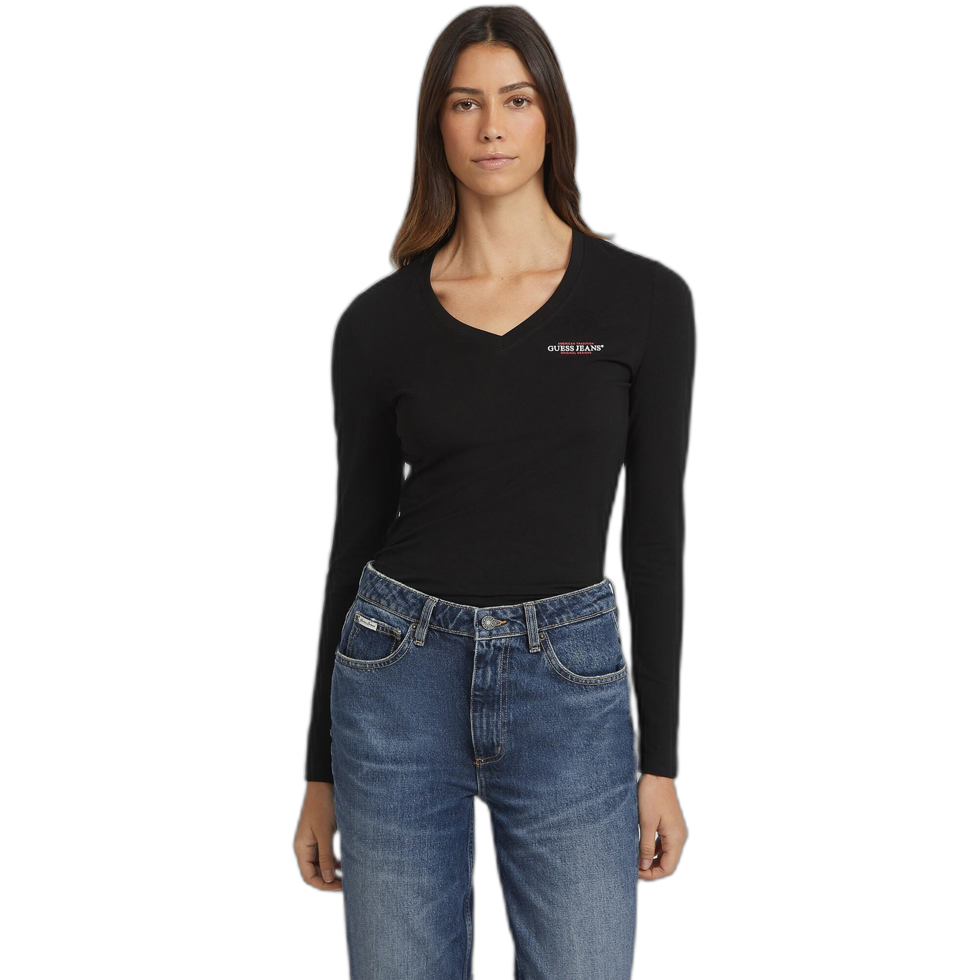 T-shirt manches longues slim col V mini America femme Guess