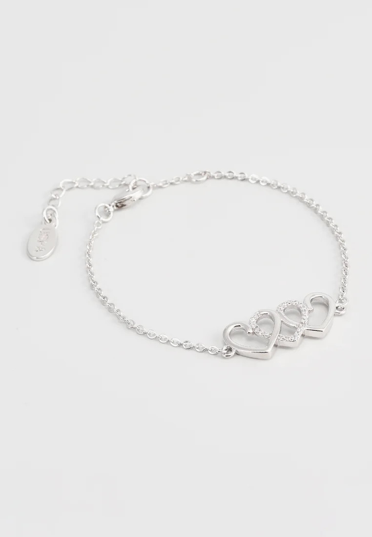 Bracelet en métal avec element central en forme de trois coeurs avec cristaux blancs. Longueur: 15 + 5 cm. Fermoir mousqueton. Plaque personnalisée avec logo. Garantie de 2 ans. Le produit est livré dans un boite avec logo.