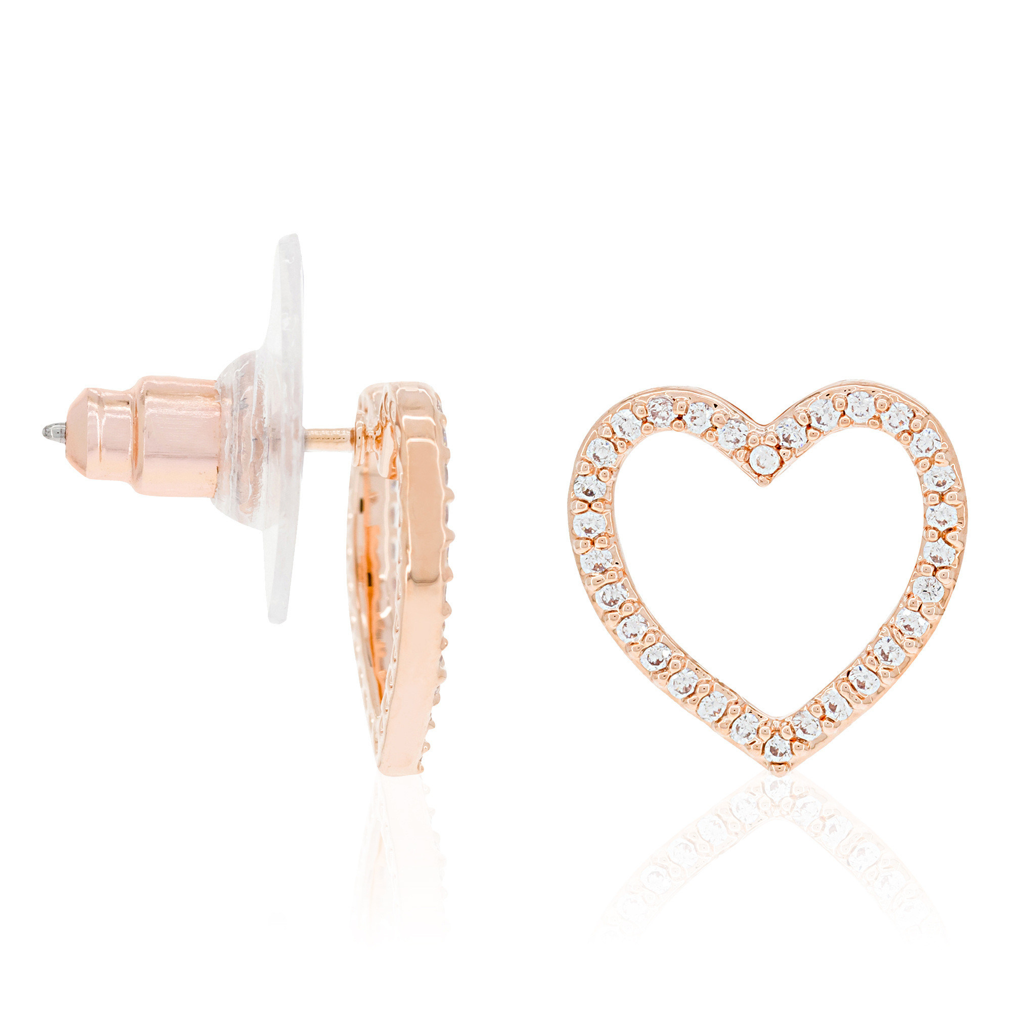 Ensemble de 2 boucles d'oreilles en métal doré rose en forme de coeur avec cristaux blancs. Longueur: 1,3 cm. Garantie de 2 ans. Le produit est livré dans un boite avec logo.