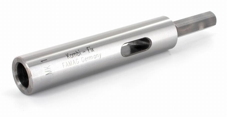 Adaptateur, cône morse 2 ou MAFELL-ZB (cylindrique interne) avec 2 vis de serrage. En combi fi xe intérieur cône morse, extérieur cylindrique avec tige hexagonale. Pour une utilisation sur des machines de menuiserie avec cône morse 2 /MAFELL-ZB pour être en mesure d'accueillir la tète de forage cylindrique. Pour tous les tète de forage cylindrique de FAMAG, mèches torses etc. Avec cet adaptateur, vous pouvez utiliser des tiges cylindriques cône morse 2 / MAFELL-ZB bon marché.