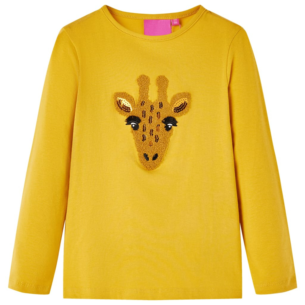 Ce t-shirt pour enfants a des manches longues, une encolure arrondie et un modèle droit. Ce t-shirt ocre foncé présente une grande girafe adorable. Le t-shirt à manches longues pour enfants est fabriqué dans un matériau doux avec 95 % de coton et 5 % d'élasthanne pour plus de confort et de respirabilité.