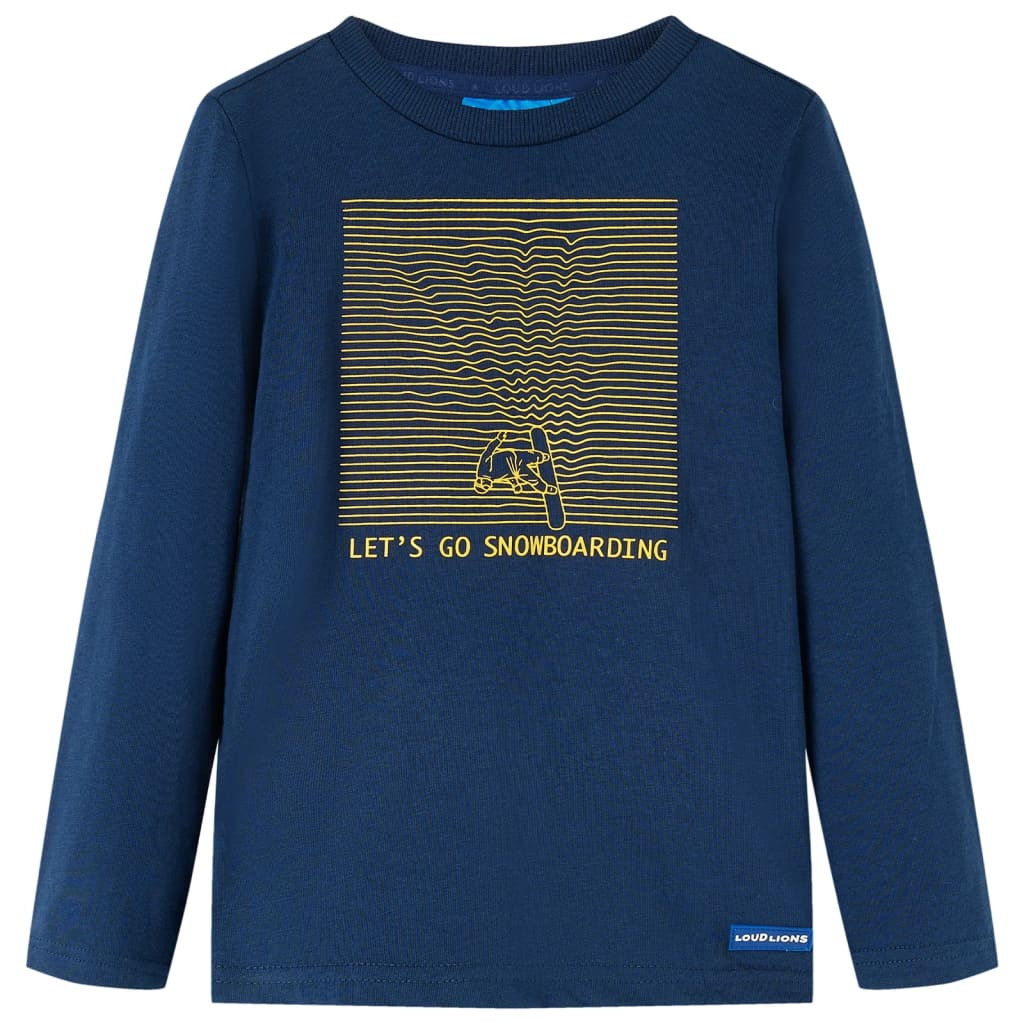 Ce t-shirt pour enfants a des manches longues, une encolure arrondie et un modèle droit. Ce t-shirt bleu marine présente un homme sur un snowboard. Ce t-shirt à manches longues pour enfants est fabriqué en 100 % coton, avec un toucher doux et confortable.