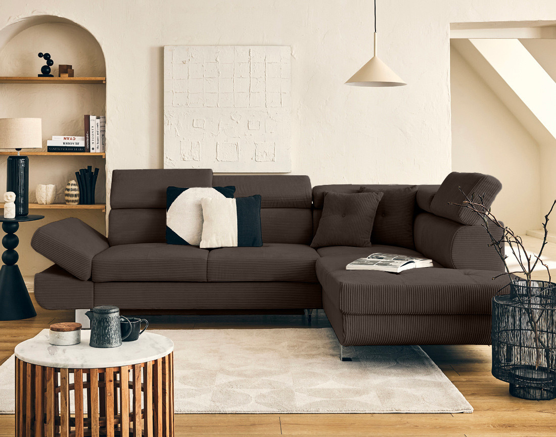 Lisbona - canapé d'angle droit 5 places convertible avec têtières en velours côtelé