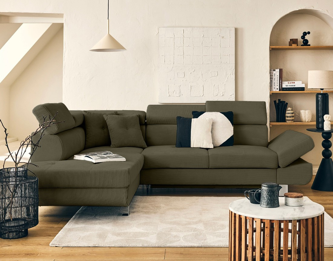 Lisbona - canapé d'angle gauche 5 places convertible avec têtières en velours côtelé