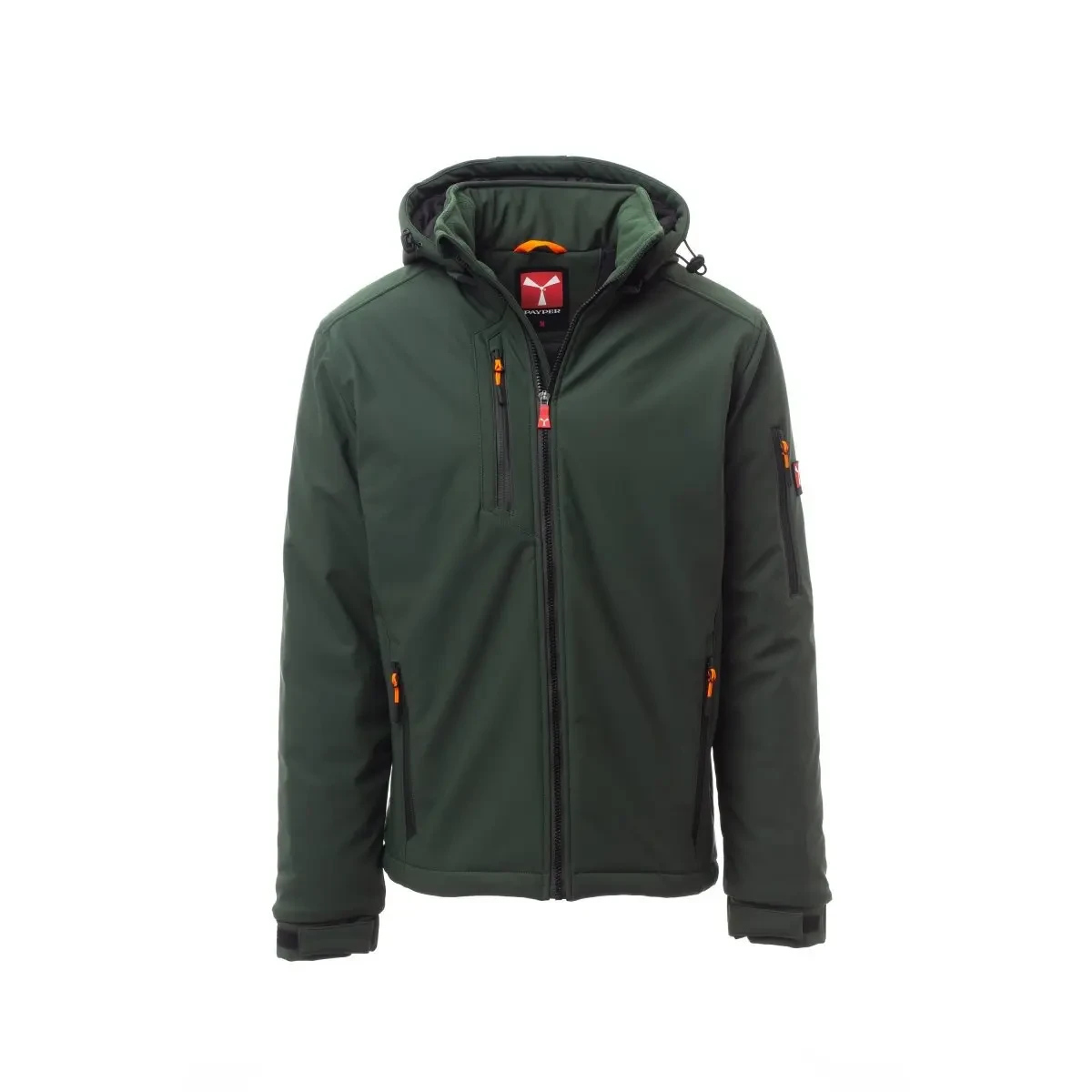 WP 8000 mm H₂O, WVT 5000 g/m² 24h. Soft-shell rembourré pour homme, fermeture par zip SBS avec curseur en métal à verrouillage semi-automatique et tirette personnalisée. Capuche amovible, avec coulisse réglable. Col intérieur avec détails latéraux en fibre polaire. Bandes rétroréfléchissantes au bas du dos et à l'arrière de la capuche. Poignets élastiques, réglables par velcro. Deux poches latérales avec zip, une poche poitrine avec zip enduit et une poche sur le bras gauche avec porte-stylos intégré, fermée par zip. Tirettes fluorescentes. Une poche passepoilée intérieure, fermée par velcro. Bas réglable avec stoppeurs personnalisés. - Composition: 78% NYLON + 22% ÉLASTHANNE - Aspect: SOFT-SHELL - Poids: 330 GR/MQ - Emballage: 1/5