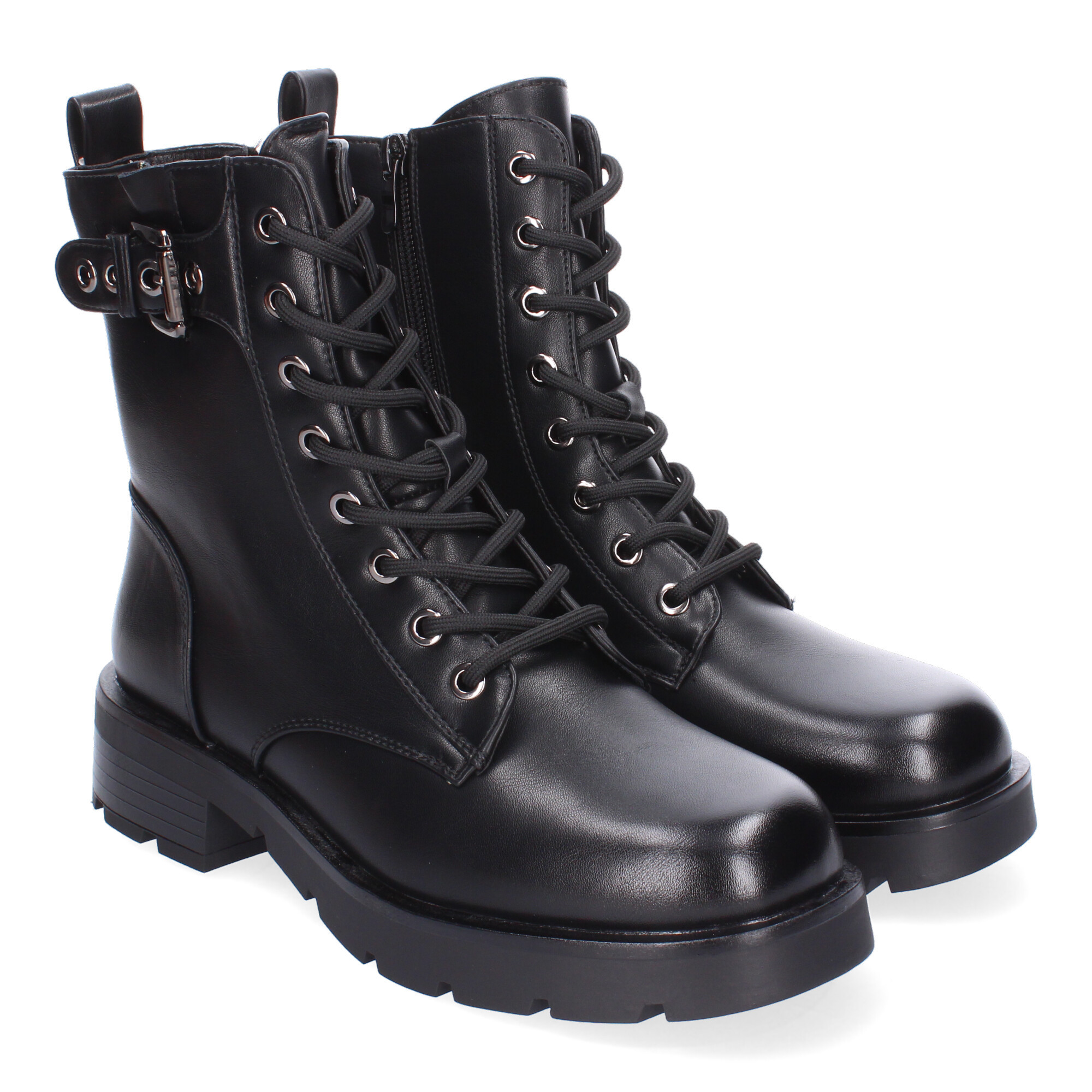 Bottines à talons pour femme, confortables et élégantes, détail boucle, avec semelle dentée, bout rond, fermeture à lacets et fermeture éclair latérale, idéales pour l'automne-hiver.