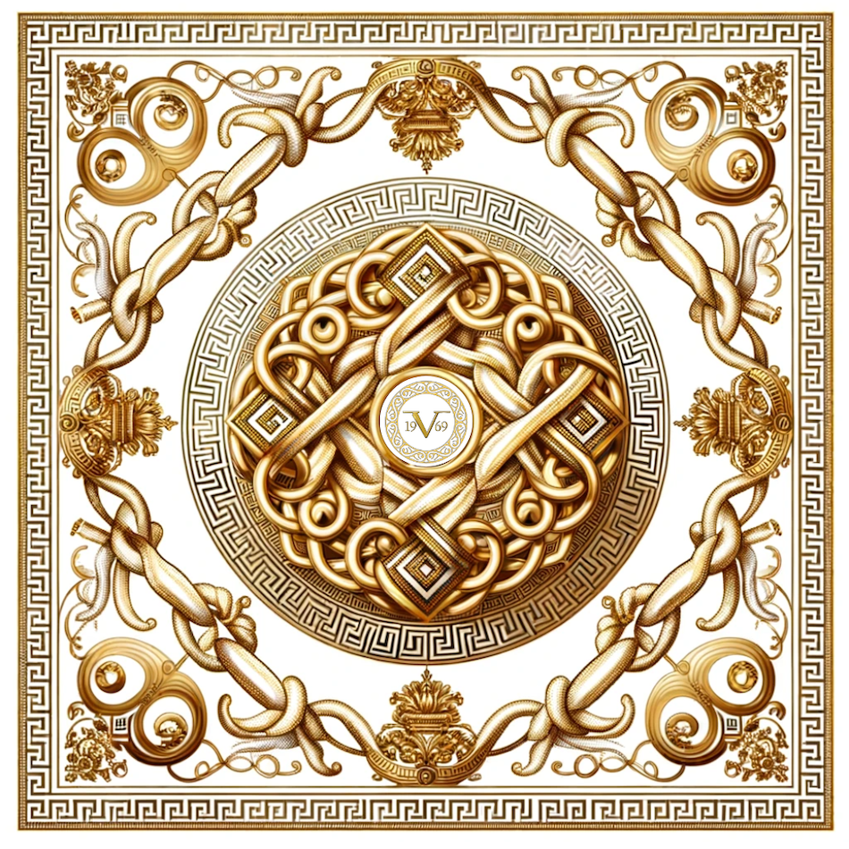 - Motif : Chaînes dorées et motifs grecs