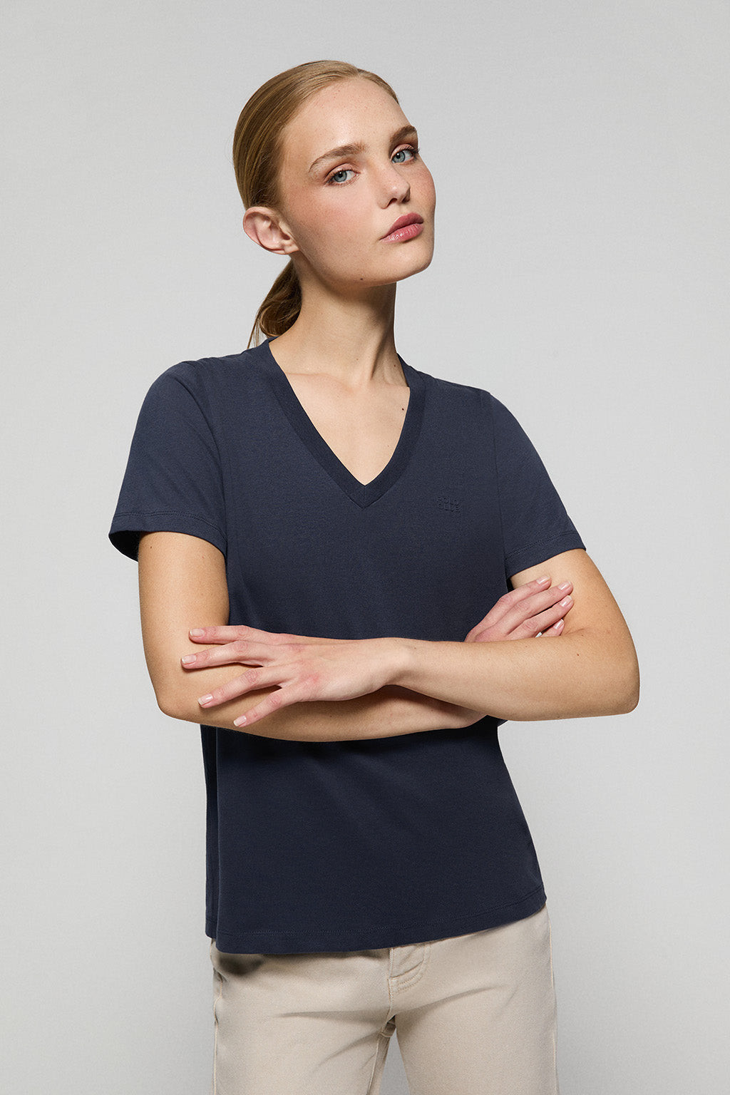 Notre T-shirt Turia est la pièce parfaite pour rehausser n’importe quel look. Ce T-shirt à manches courtes et à col en V côtelé est fabriqué à 100 % en coton avec une finition effet pêche avec un grammage plus important, ce qui rend le vêtement confortable, doux et durable. Sa coupe loose, légèrement plus large, en fait un vêtement confortable et féminin. Son imprimé caoutchouté Regular block ton sur ton sur la poitrine et ses surpiqûres contrastantes personnalisées en font le basique essentiel de votre garde-robe.
