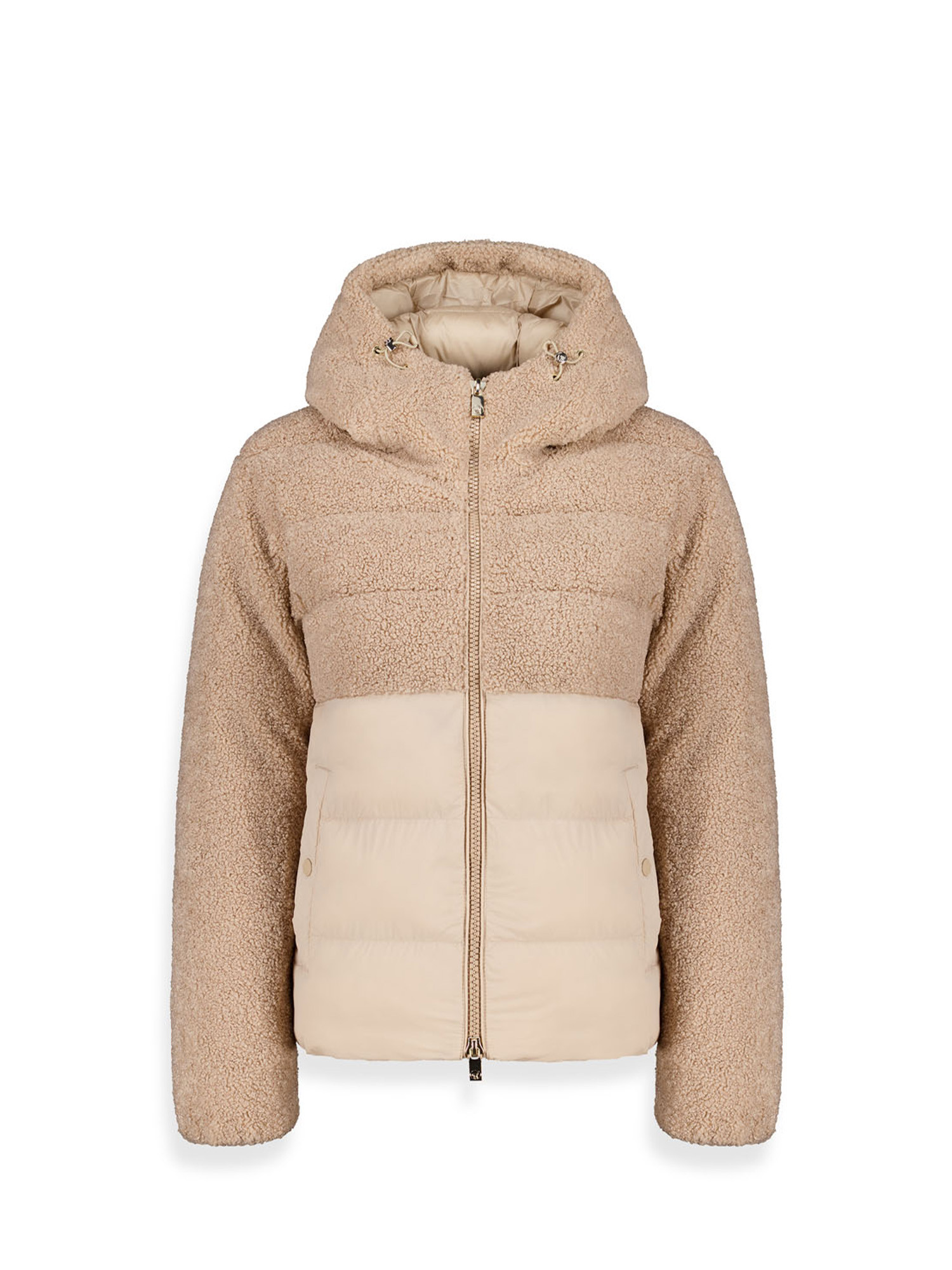 Description : doudoune hybride pour femme rembourrée en duvet écologique ; avec une silhouette matelassée qui combine un tissu d'apparence cuir semi-brillant et des panneaux en peluche doux pour une sensation de confort.
