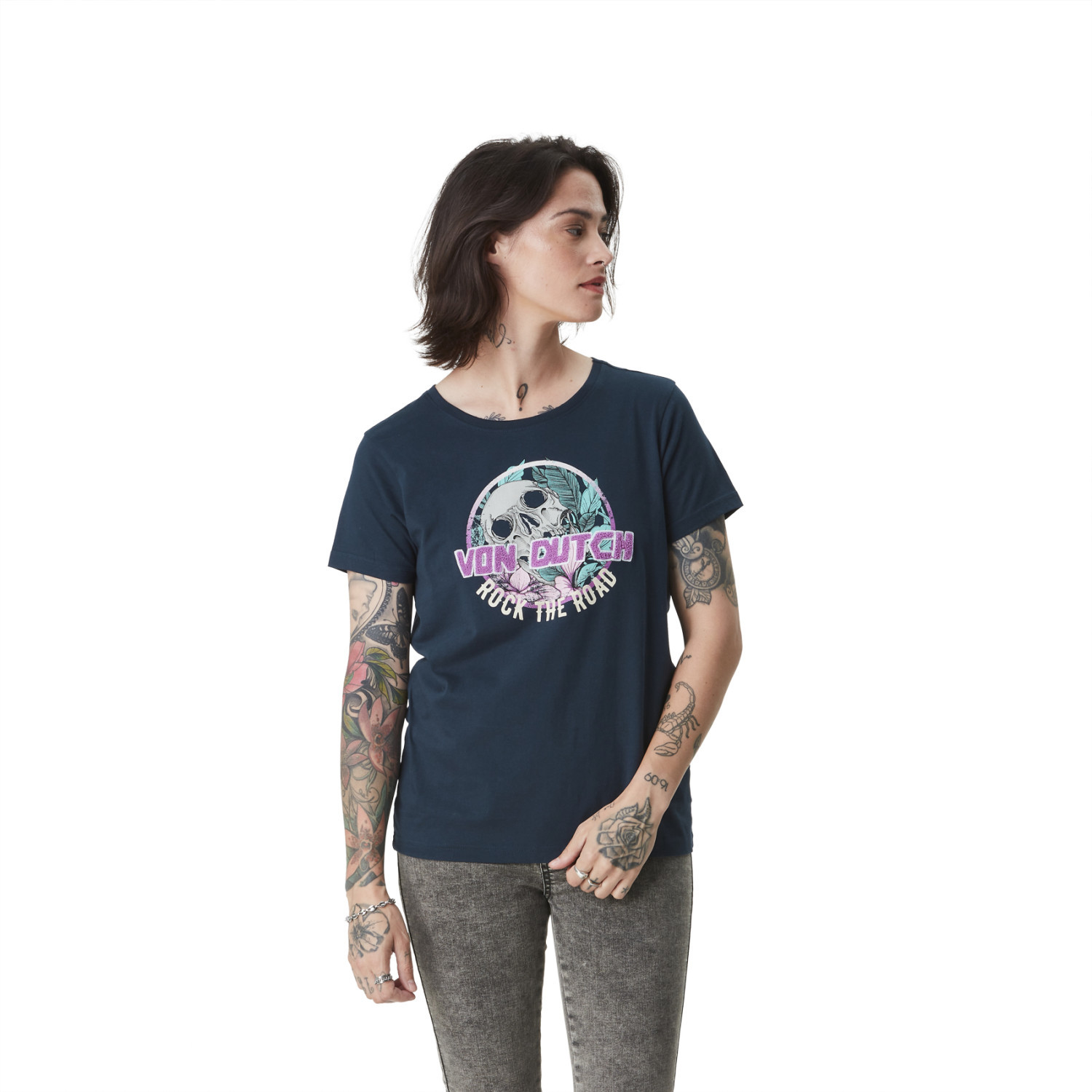 Information sur l'offre : Le Tee shirt femme Von Dutch Fleurs, en bleu marine, est un incontournable pour toute garde-robe moderne. Avec sa coupe regular fit, ce haut s'adapte parfaitement à toutes les silhouettes, offrant confort et style. Son col rond et ses manches courtes le rendent idéal pour une journée décontractée ou pour une sortie entre amis. L'imprimé "Von Dutch Rock the road" à l'avant, agrémenté d'un logo Von Dutch avec une bouclette rose, ajoute une touche de fantaisie et d'élégance à votre look. Confectionné en 100% coton avec un effet flammé, ce t-shirt assure douceur et respirabilité, tout en étant disponible dans une large gamme de tailles allant de XS à XL.Von Dutch est une marque qui incarne l'esprit du style décontracté tout en étant à la pointe des tendances. Chaque pièce de leur collection est conçue avec soin, offrant une qualité exceptionnelle et un design audacieux. En plus de ce t-shirt, vous trouverez également une variété d'autres produits Von Dutch, tels que des casquettes, des bobs, des chemises, des shorts et des vestes, permettant ainsi de composer des looks variés et uniques. Que ce soit pour une tenue de tous les jours ou pour un événement spécial, Von Dutch a tout ce qu'il faut pour vous aider à exprimer votre style personnel avec confiance. Coton : 100% Coton