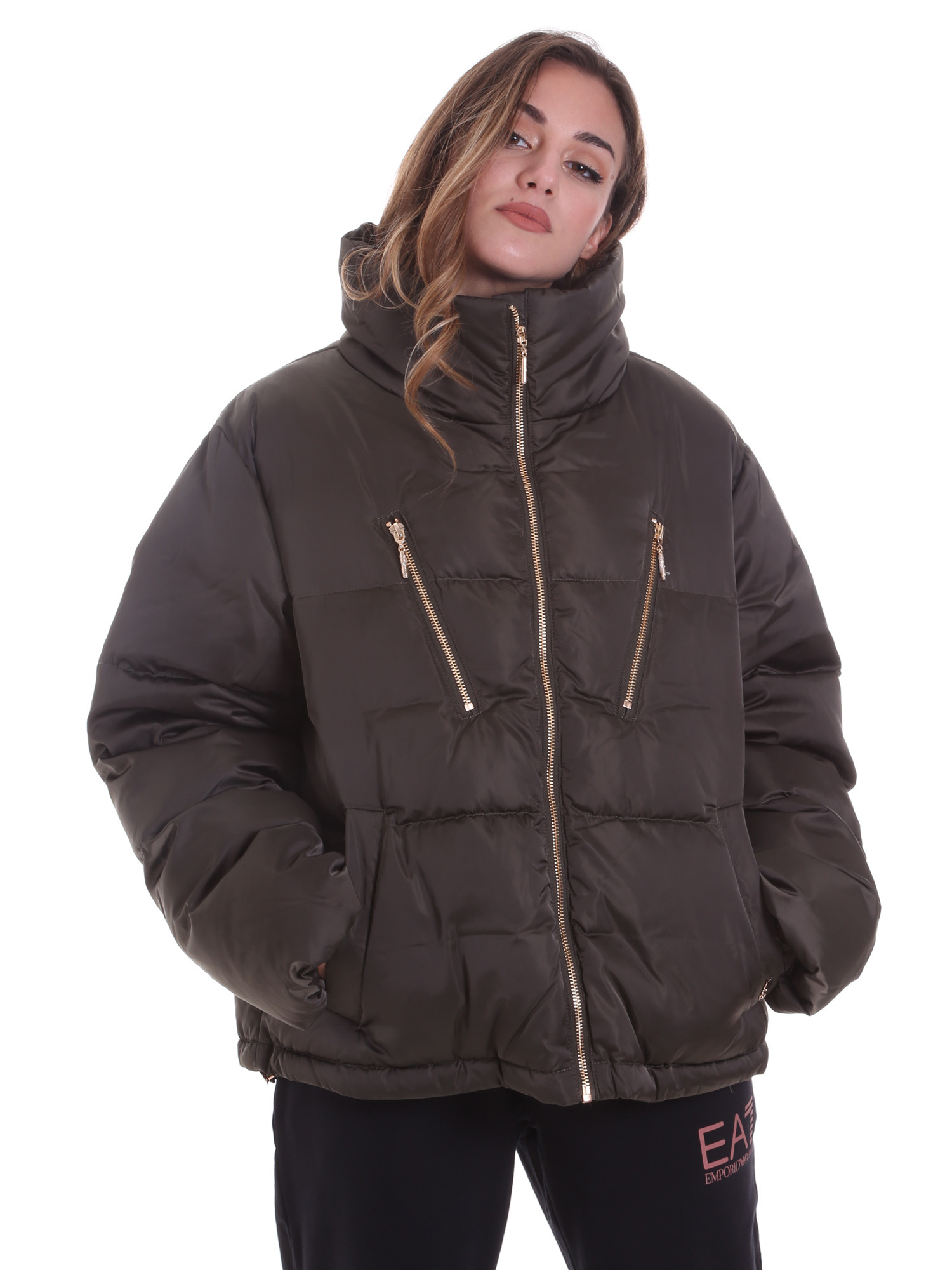 Description: Doudoune courte en nylon opaque avec rembourrage en duvet véritable, col large, poches, logo monogramme matelassé intégral dans le dos et fermeture confortable avec zip.