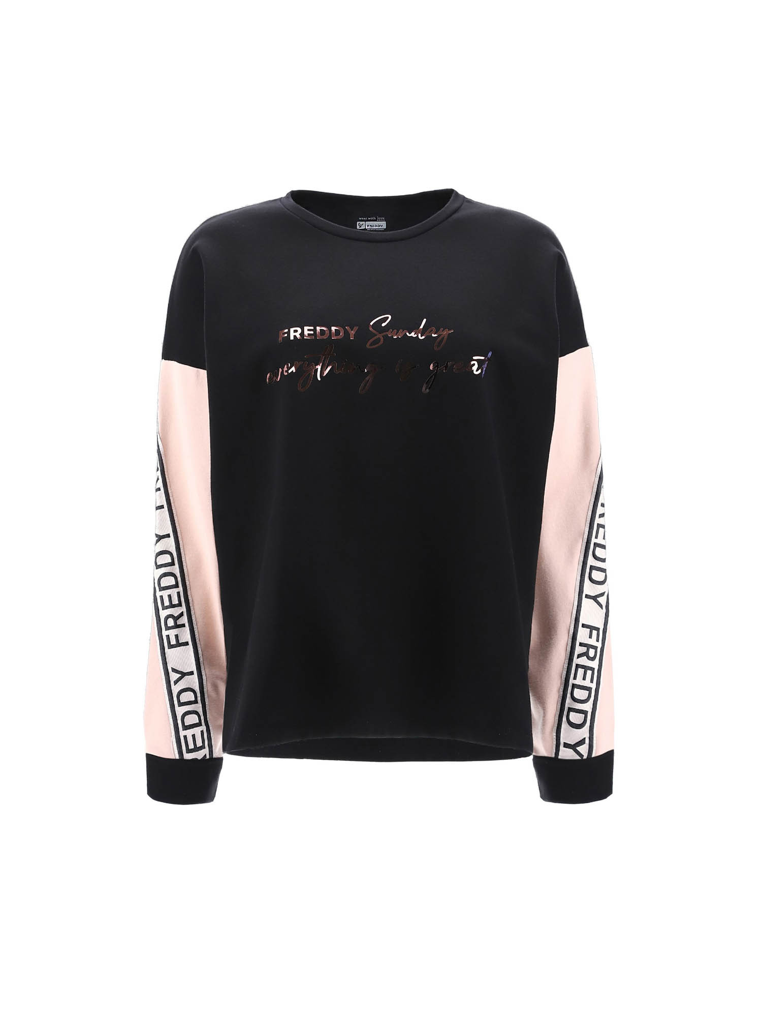 Description : Sweat court oversize avec imprimé brillant sur le devant et ruban le long des manches avec logo FREDDY brodé.