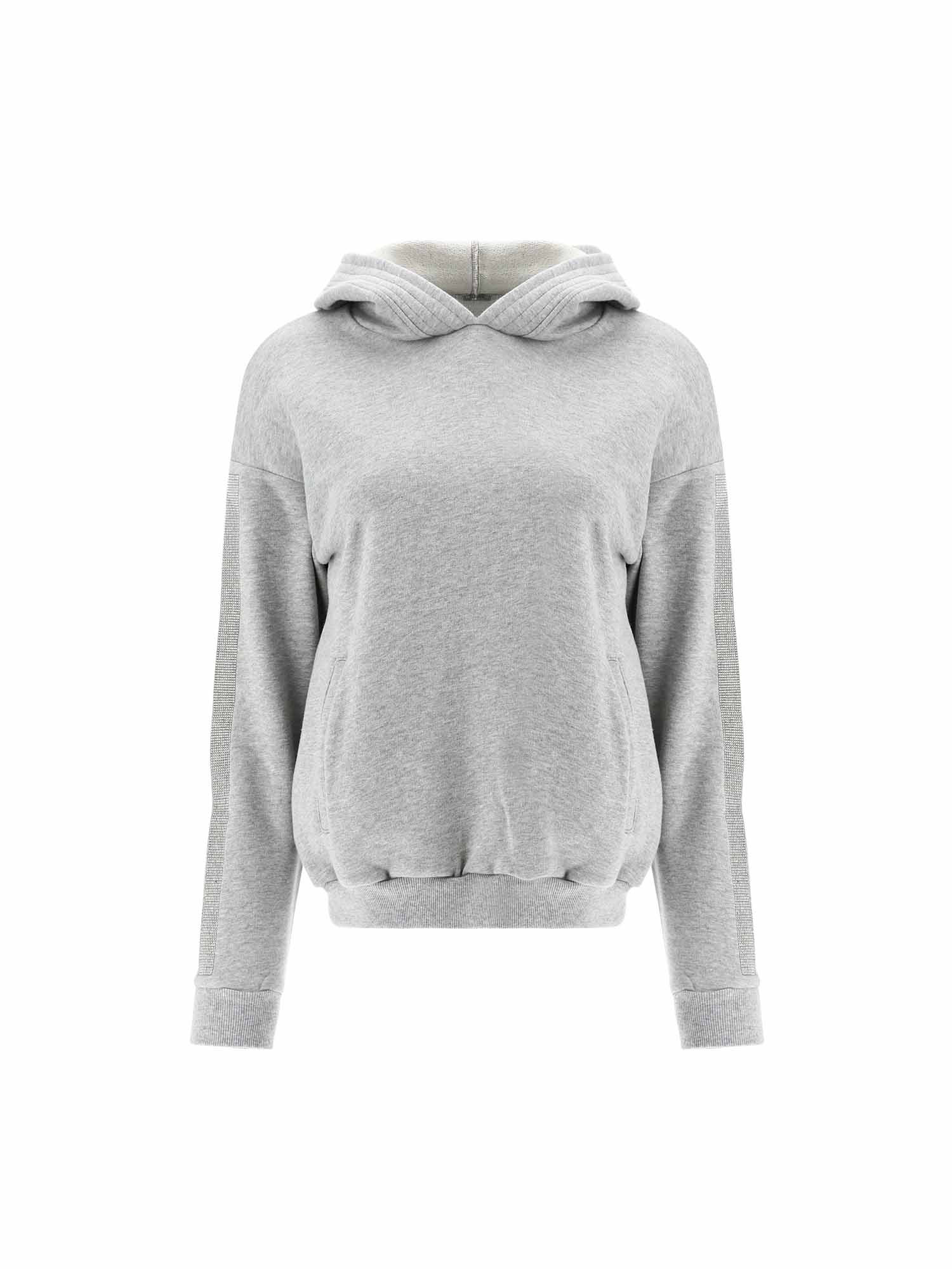 Description : Sweat-shirt en molleton doux et gris clair mélangé avec capuche et bandes latérales en micro strass argentés qui courent le long des manches.