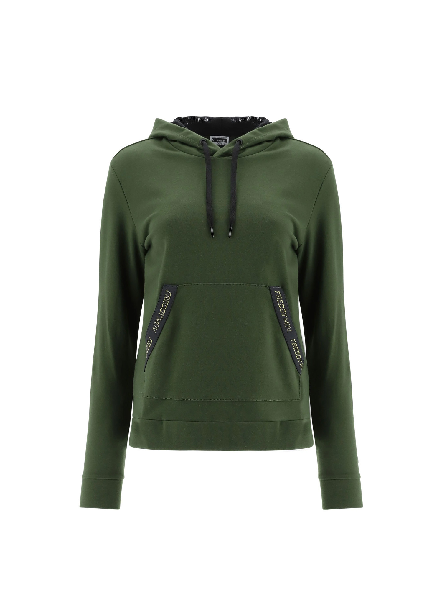 Description : Ce sweat à capuche de coupe classique est décoré d'un FREDDY MOV en paillettes blanches et dorées. impression sur une manche et ruban jacquard noir avec logo pour finir les poches.