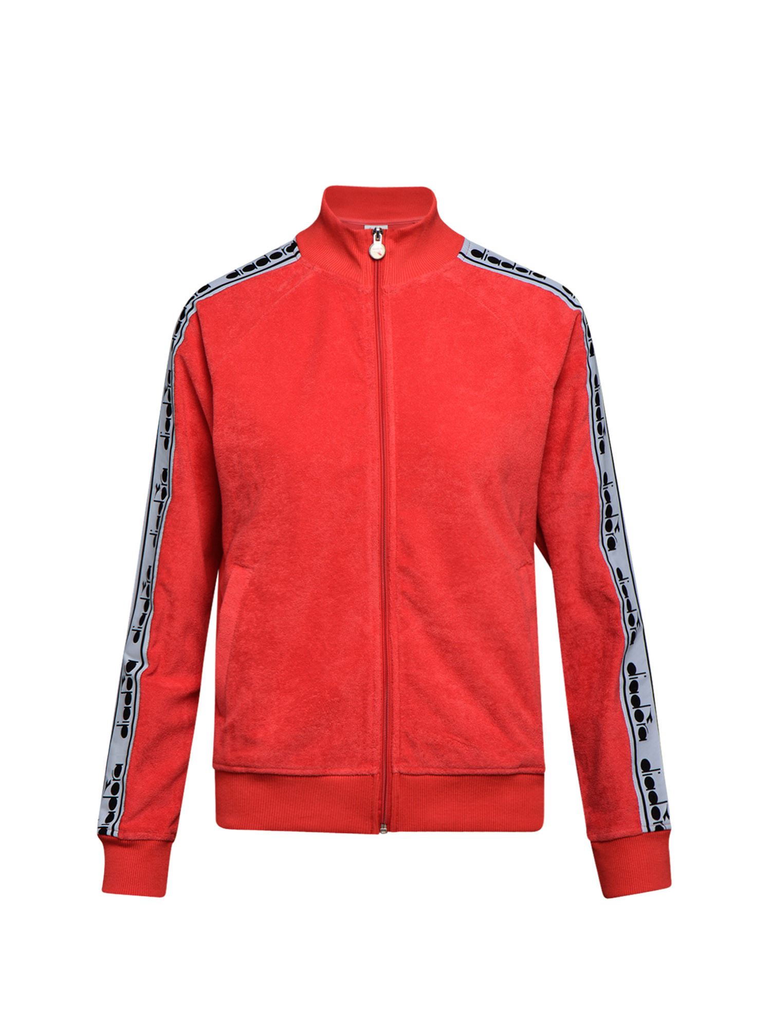 Bande de logo sur les épaules et les manches, fermeture éclair complète et poches avant.