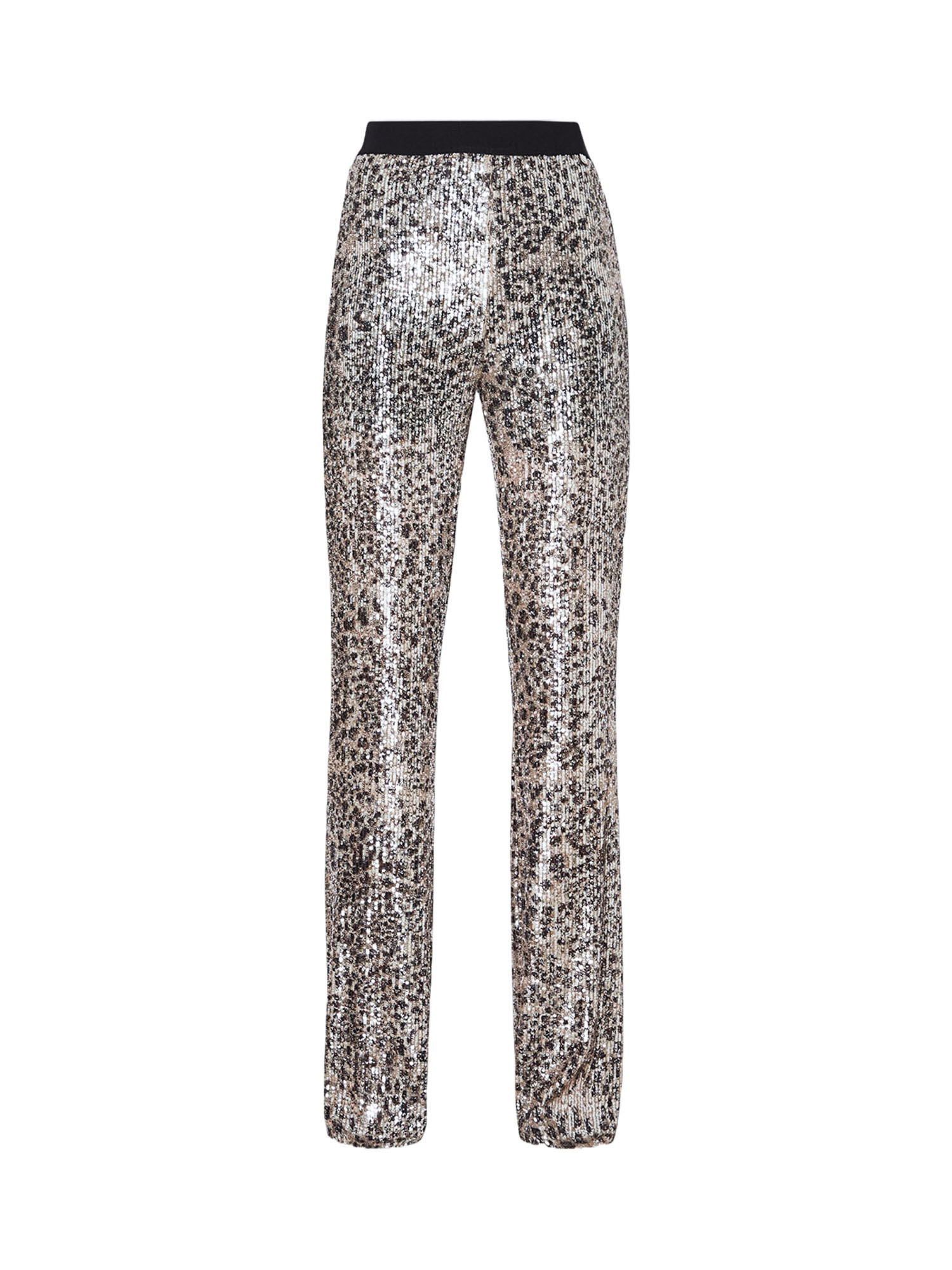 Ligne douce et droite sur la jambe, tissu fluide illuminé de sequins all-over et imprimé d'inspiration animalière en fond.