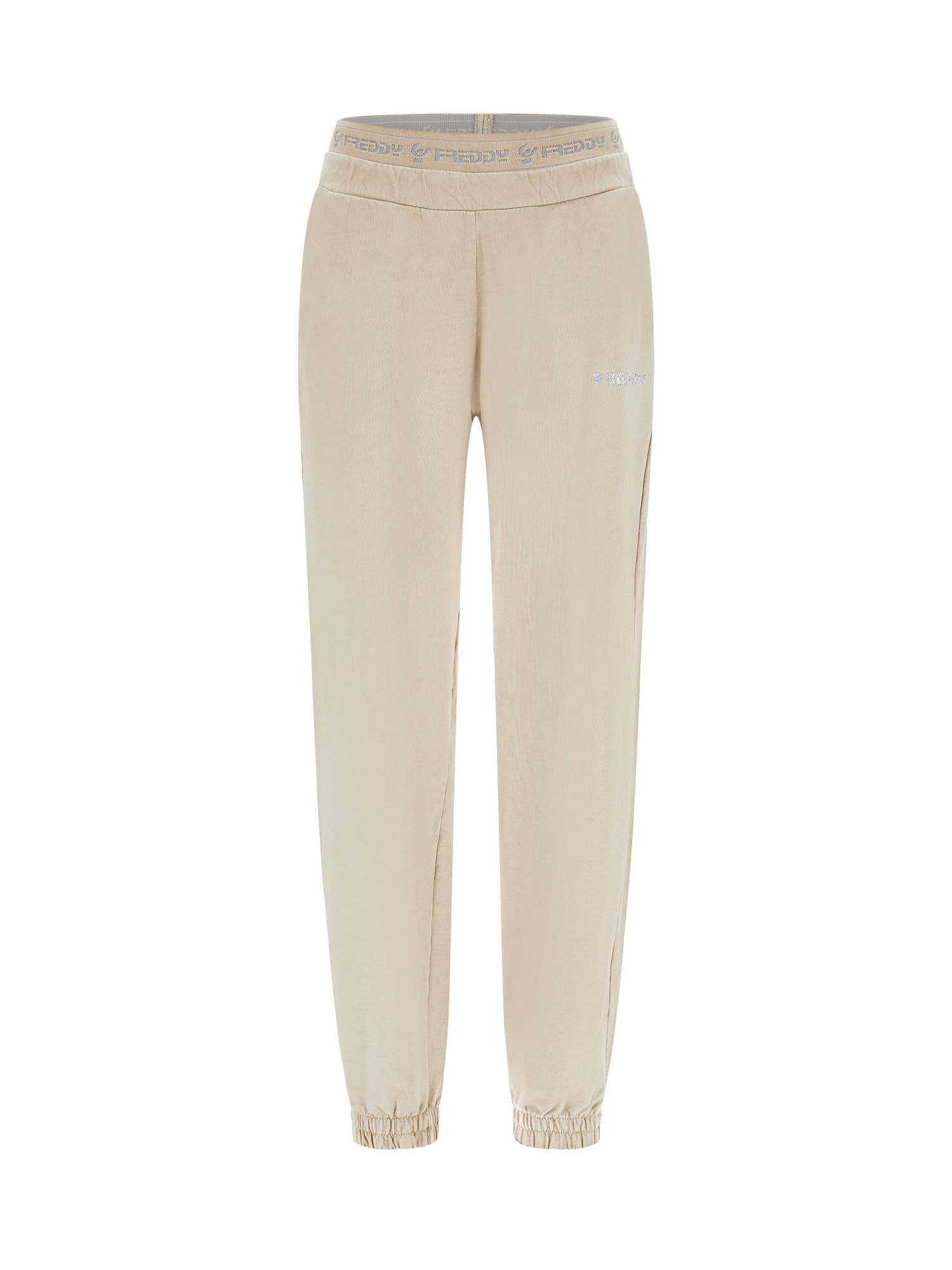 Description : pantalon sportif en jersey stretch épais de couleur fluo, teint en pièce avec élastique logoté visible à la taille.