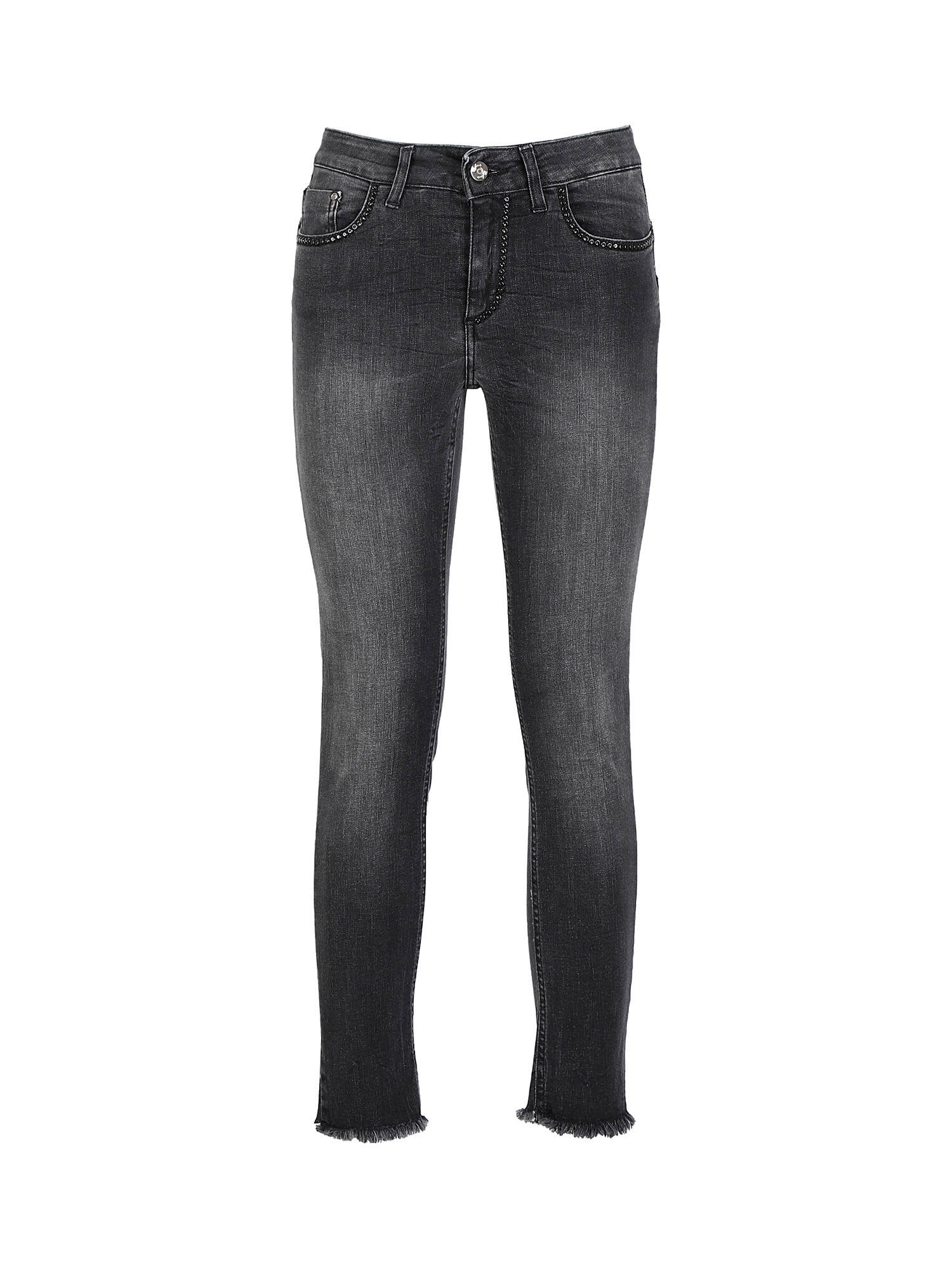 Description : denim délavé foncé, étiquette logo, poches avec clous décoratifs appliqués.
