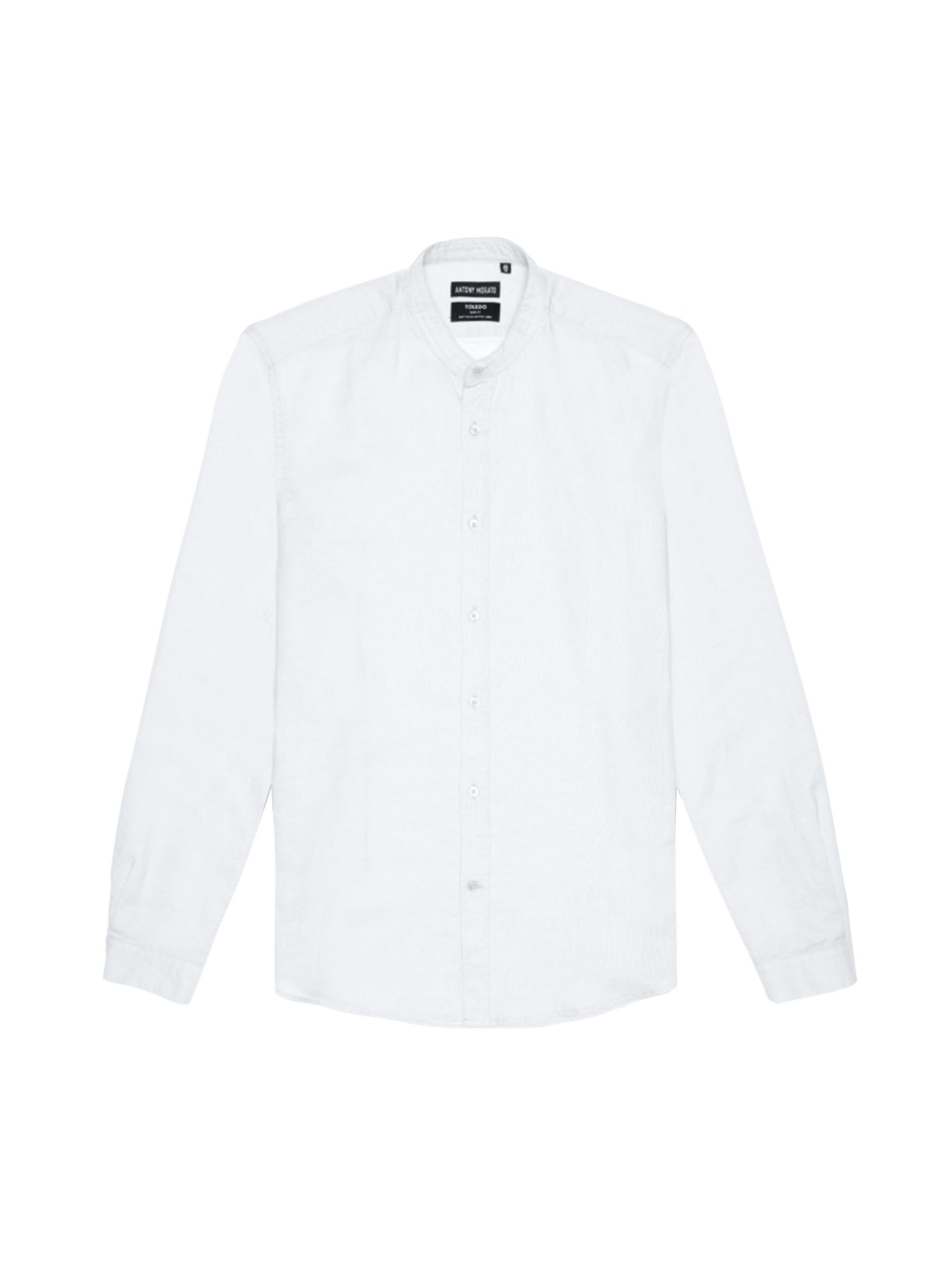 Le modèle est complété par un col mao, un boutonnage apparent, des poignets boutonnés et un ourlet arrondi.