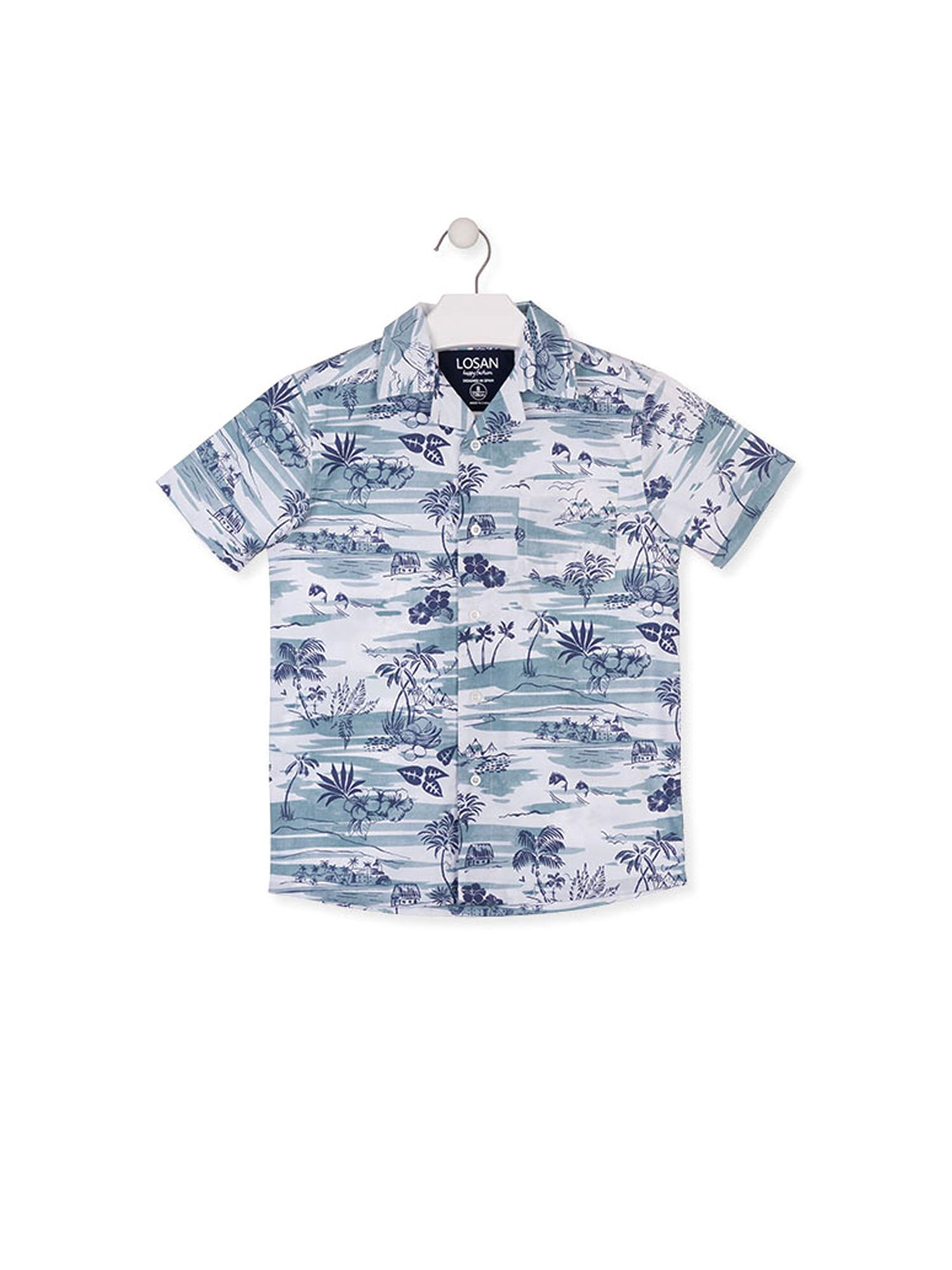 Description: chemise à motif tropical en popeline bleue avec poche poitrine.