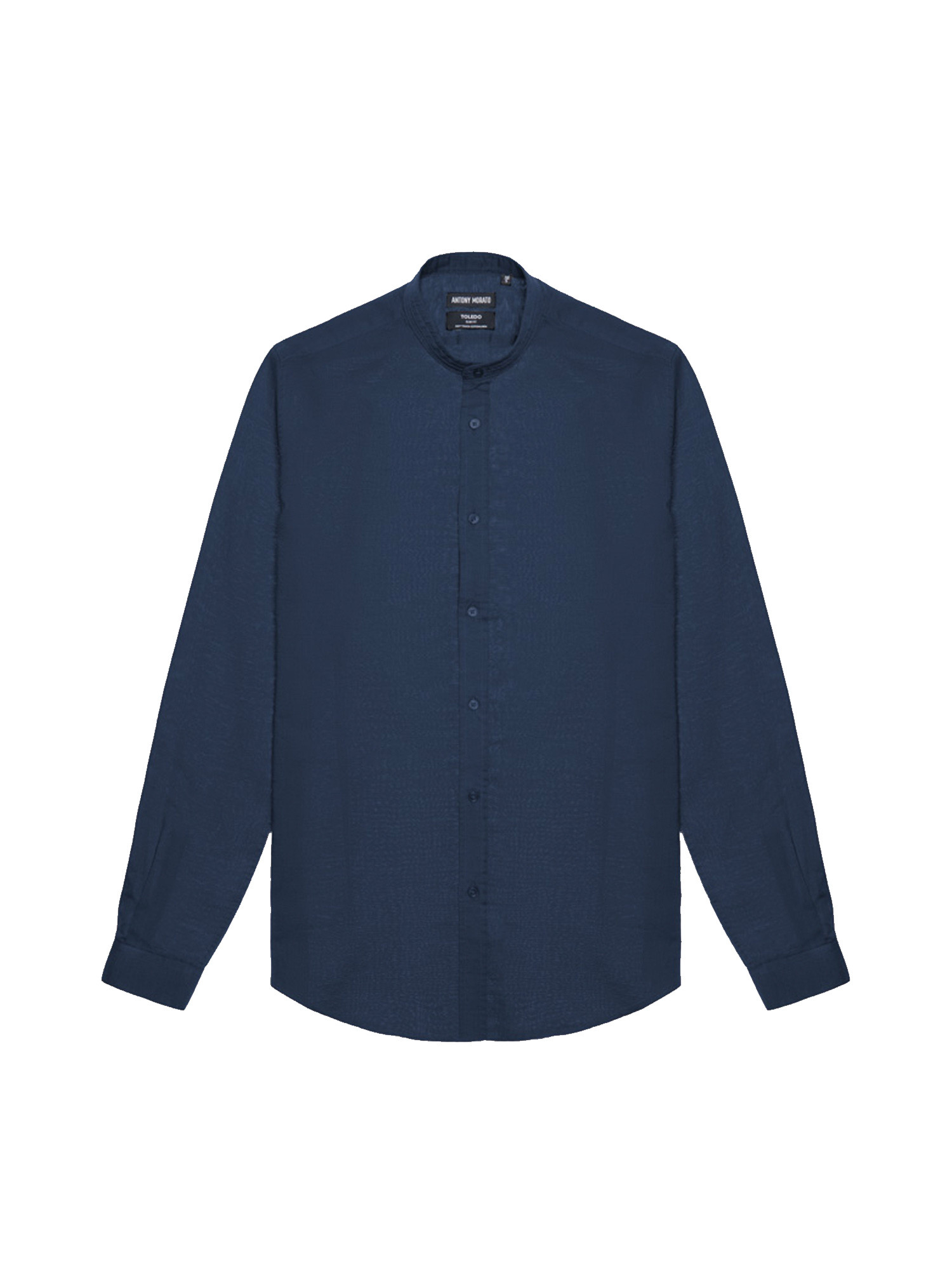 Doux et léger, il est proposé avec un col mao, un boutonnage apparent et une coupe cintrée.