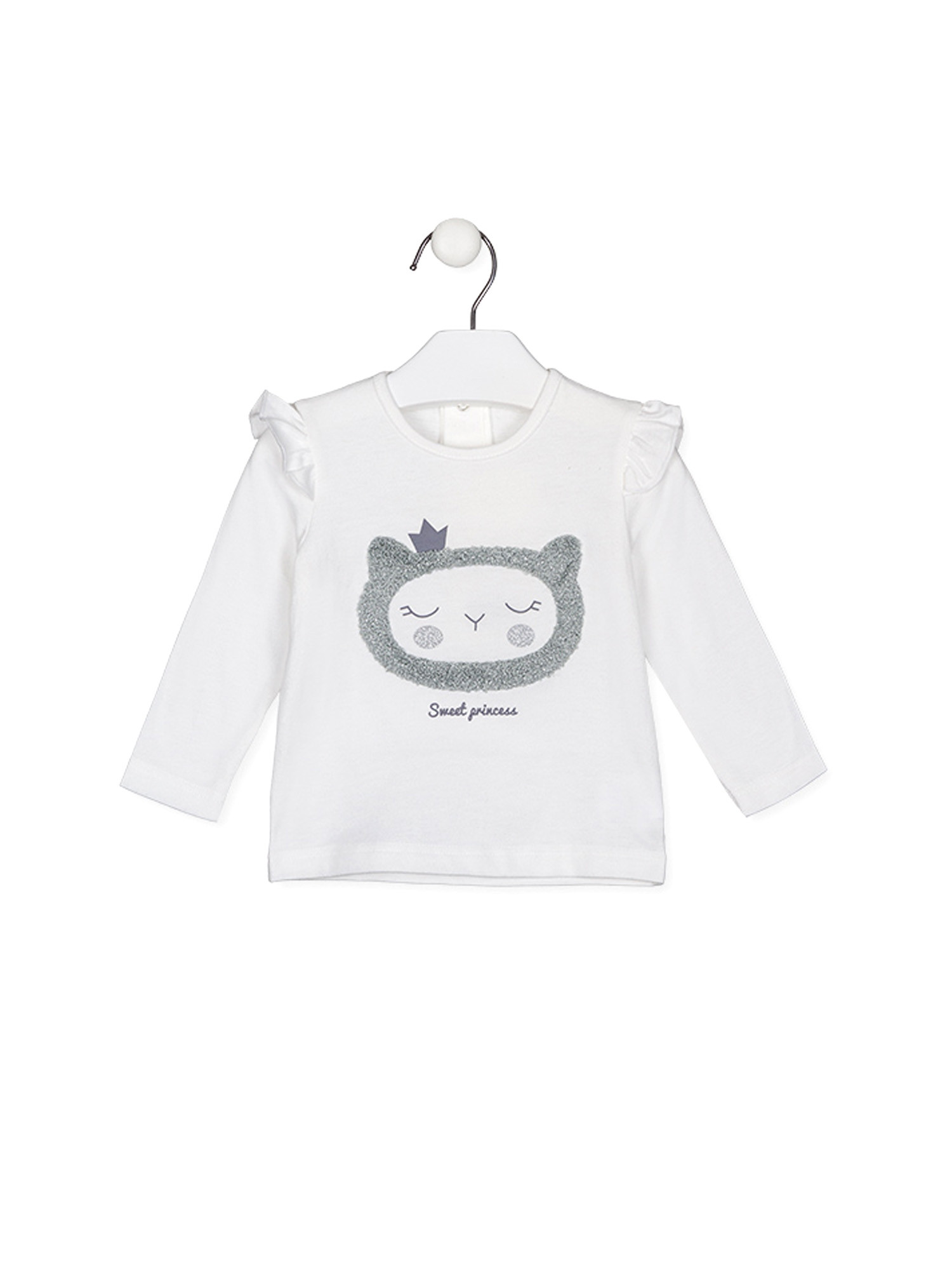 Description : chemise à manches longues avec volants sur les épaules et encolure ronde.
